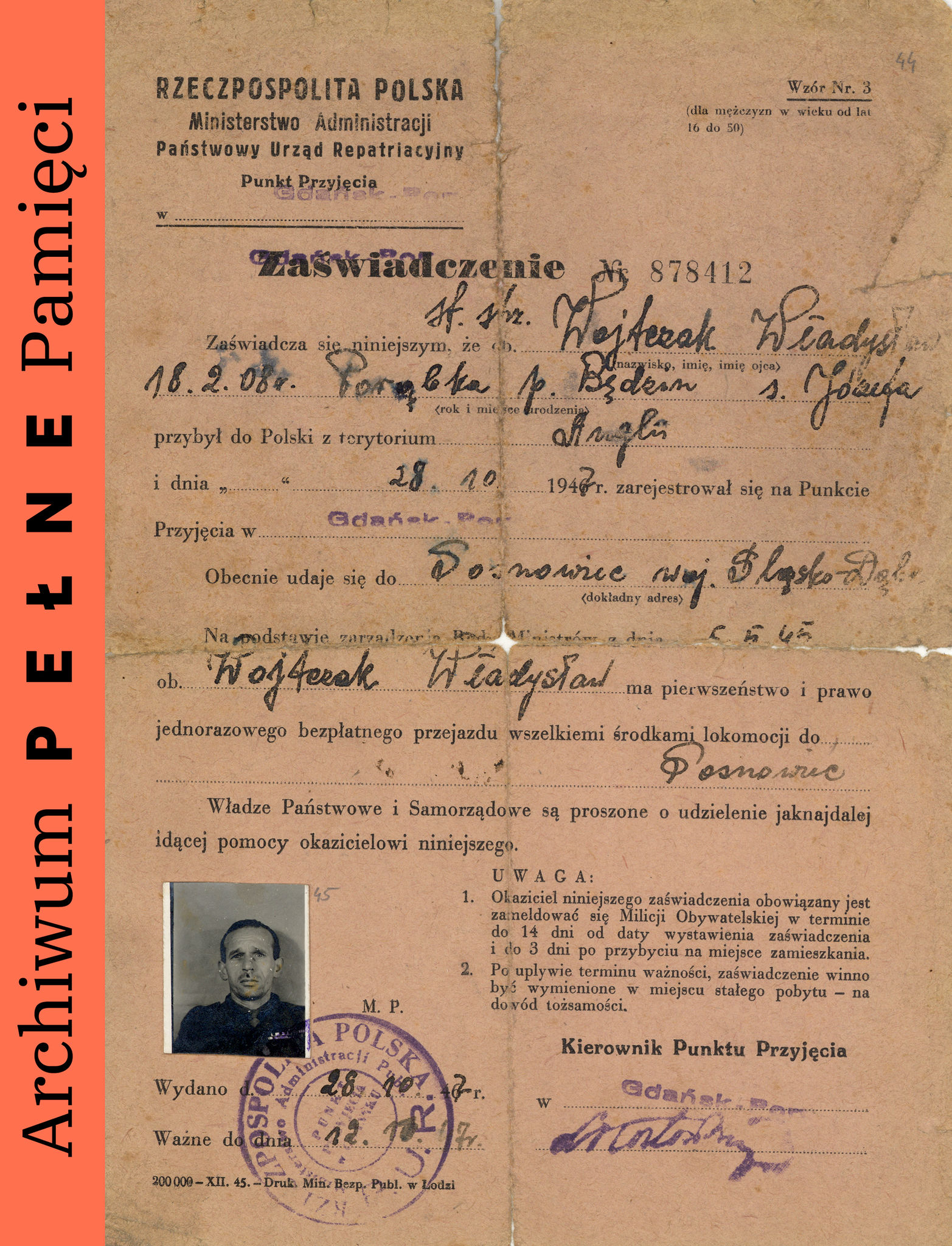 Zaświadczenie nr 878412 wydane dla Władysława Wojtczaka przez Państwowy Urząd Repatriacyjny Punkt Przyjęcia w Gdańsku, 28.10.1947 r., IPN Ka 454/140 -