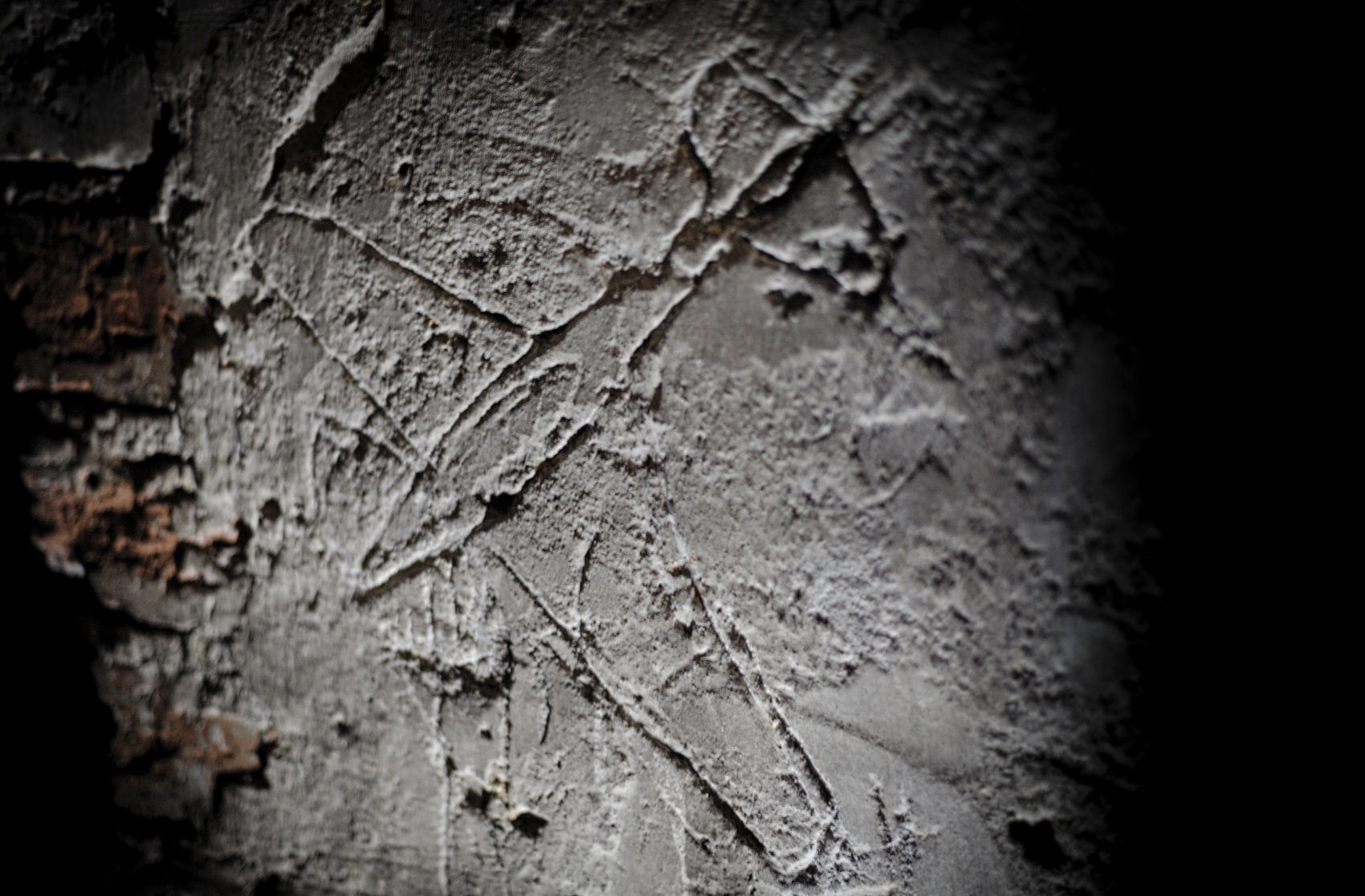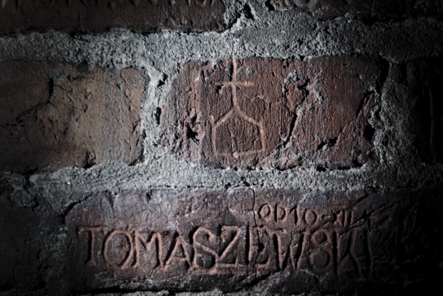 Surowe cegły i zaprawa, ale także drewno drzwi – kryją niezliczone świadectwa obecności uwięzionych. Wydrapane w ciemności inskrypcje zdradzają czasem ich tożsamość – głośny krzyk – jak ostatnie memento przed spodziewaną śmiercią. W tym kamiennym skarbcu są również rzeczy drogie w chwili cierpienia, obrazy normalnego napowietrznego świata. Są ważne, osobiste daty i proste kalendarze, które pozwalały zachować wątłą łączność z przerwanym tokiem życia. Majaczą niekiedy słowa straszne, wyryte w chwili desperacji. Jakby w opozycji do nich, podświetlony bocznym światłem, wyłania się cały wyrzeźbiony labirynt znaków wiary – krzyży, kapliczek, potężnych zaklęci Nadziei... BÓG Z NAMI – woła jedna z inskrypcji.