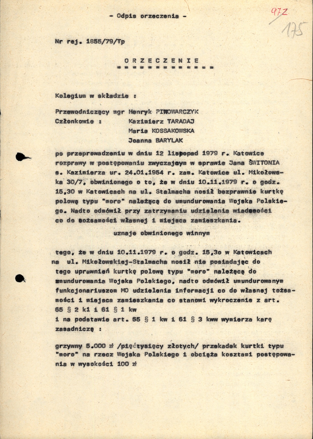 Odpis orzeczenia w sprawie ukarania Jana Świtonia w listopadzie 1979 r. przez Kolegium ds. Wykroczeń za bezprawne noszenie kurtki polowej typu „moro” (AIPN Ka 029/698, t. 5) -