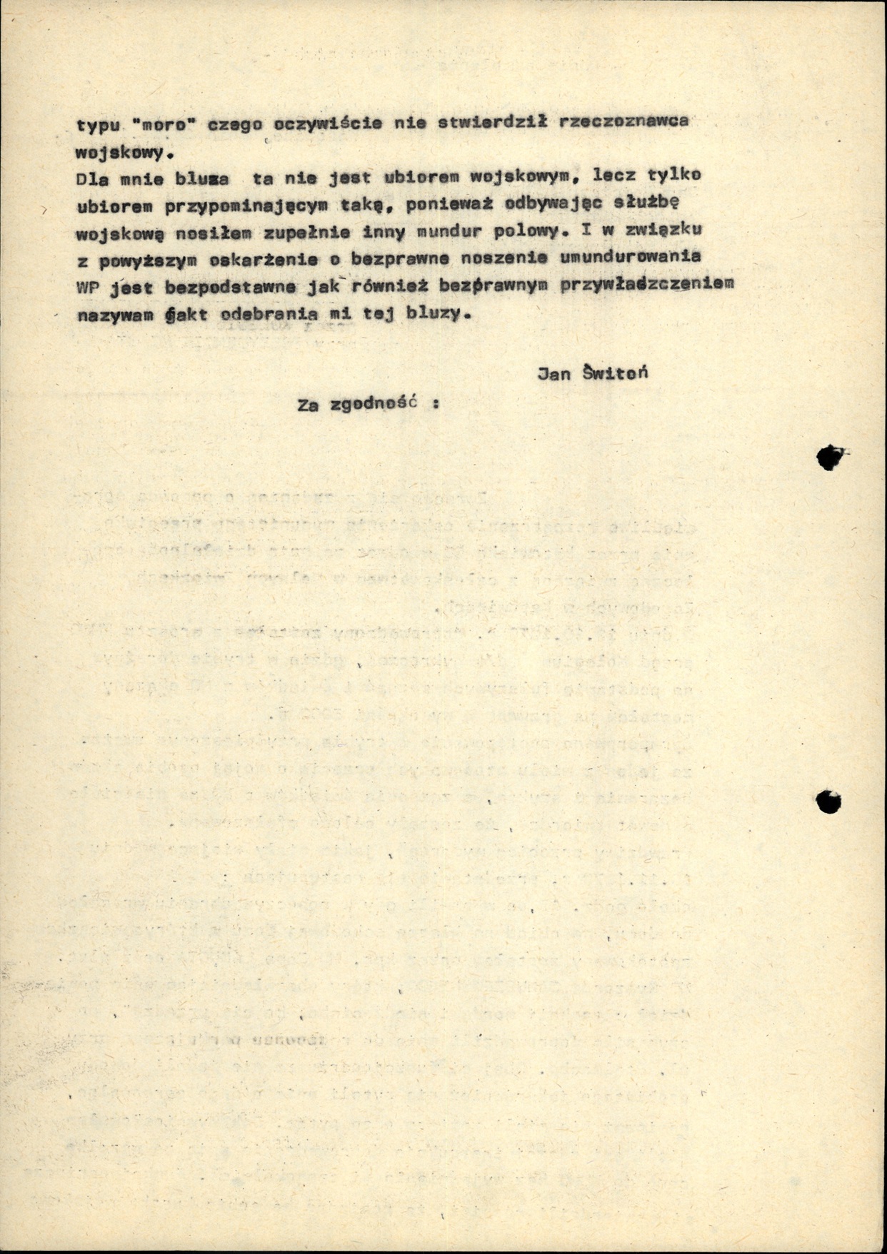 Odpis odwołania Jana Świtonia od ukarania go w listopadzie 1979 r. przez Kolegium ds. Wykroczeń za bezprawne noszenie kurtki polowej typu „moro” (AIPN Ka 029/698, t. 5) -