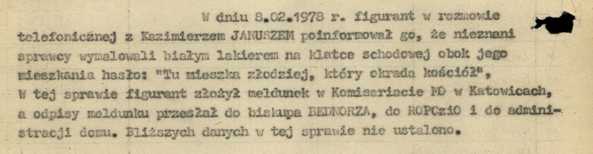Fragment meldunku Wydz. III KWMO Katowice z 10 II 1978 r. zawierający informacje m.in. o działaniach mających skompromitować K. Świtonia (AIPN Ka 048/916) -