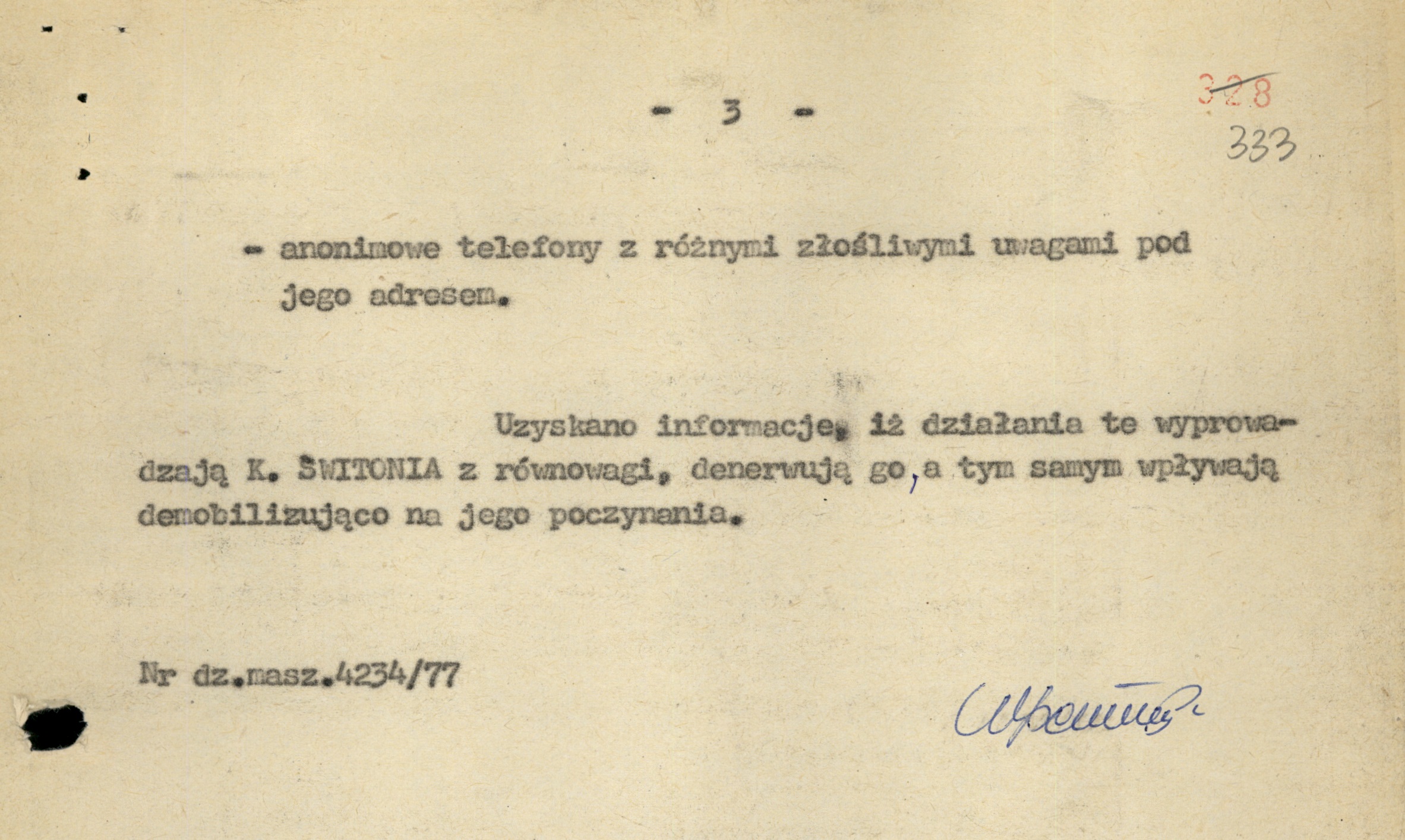 Fragment meldunku Wydz. III KWMO Katowice z 28 XI 1977 r. zawierający informację m.in. o sposobach nękania K. Świtonia przez SB (AIPN Ka 048/916, t. 1) -