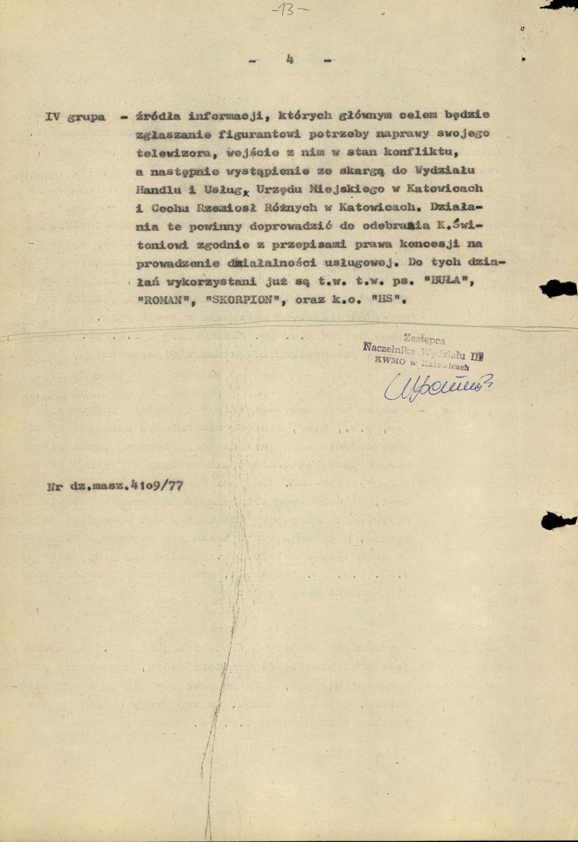 Meldunek Wydz. III KWMO Katowice z 5 I 1978 r. z odpisem decyzji Wydz. Handlu i Usług Urzędu Miejskiego w Katowicach cofającej K. Świtoniowi uprawnień rzemieślniczych i zobowiązującej do likwidacji jego zakładu usługowego (AIPN Ka 048/916, t. 1, k. 294–295) -