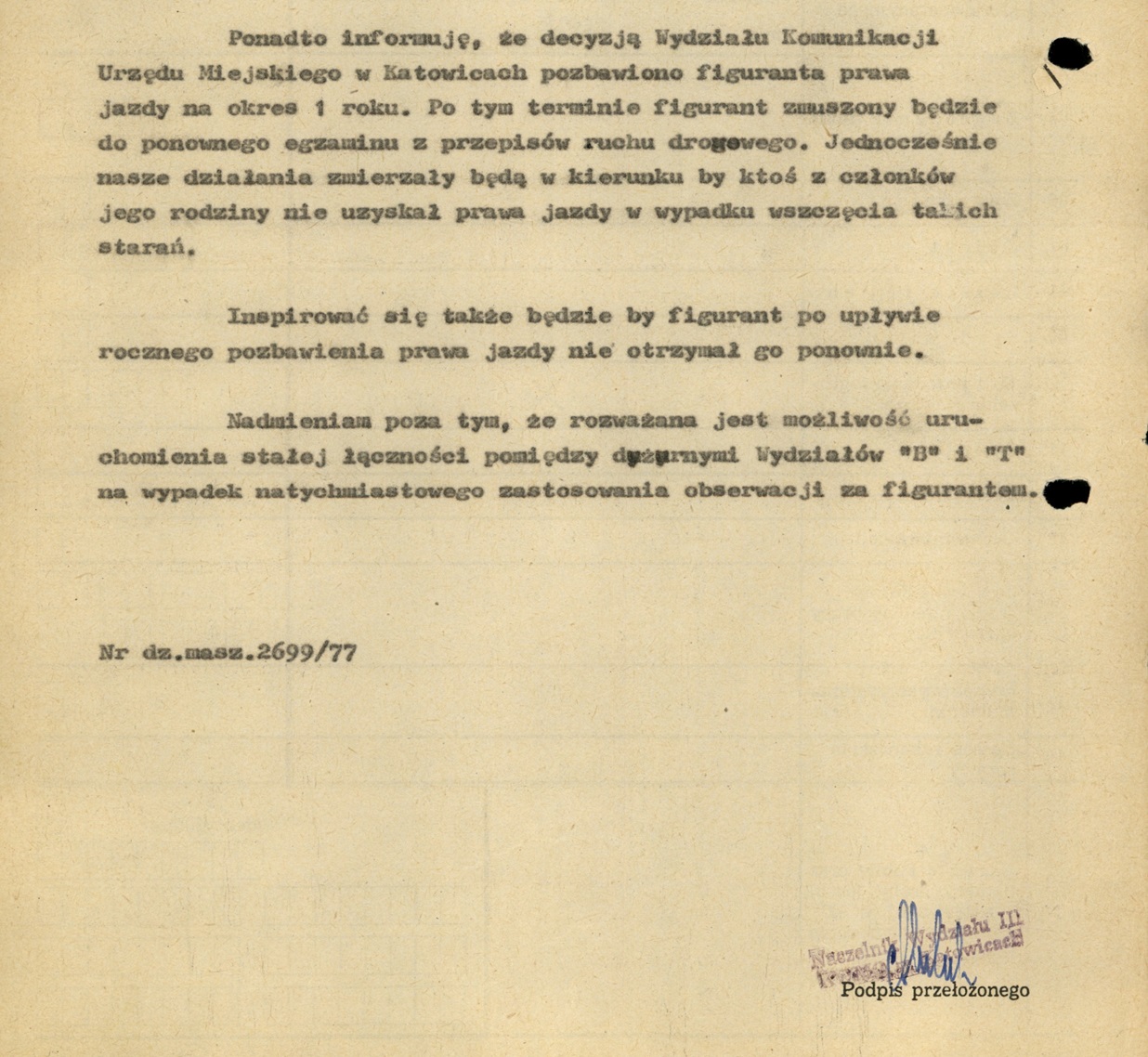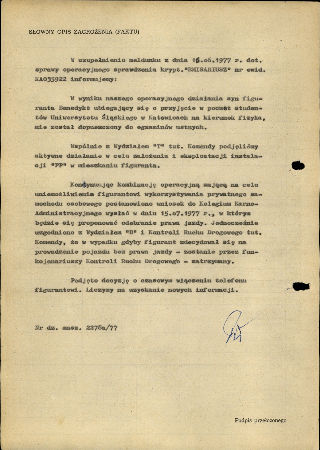 Meldunek Wydz. III KWMO Katowice z 6 VII 1977 r. z informacją o działaniach operacyjnych wobec rodziny K. Świtonia (niedopuszczenie syna do egzaminów wstępnych na studia, pozbawienie K. Świtonia prawa jazdy; AIPN Ka 048/916, t. 1) -