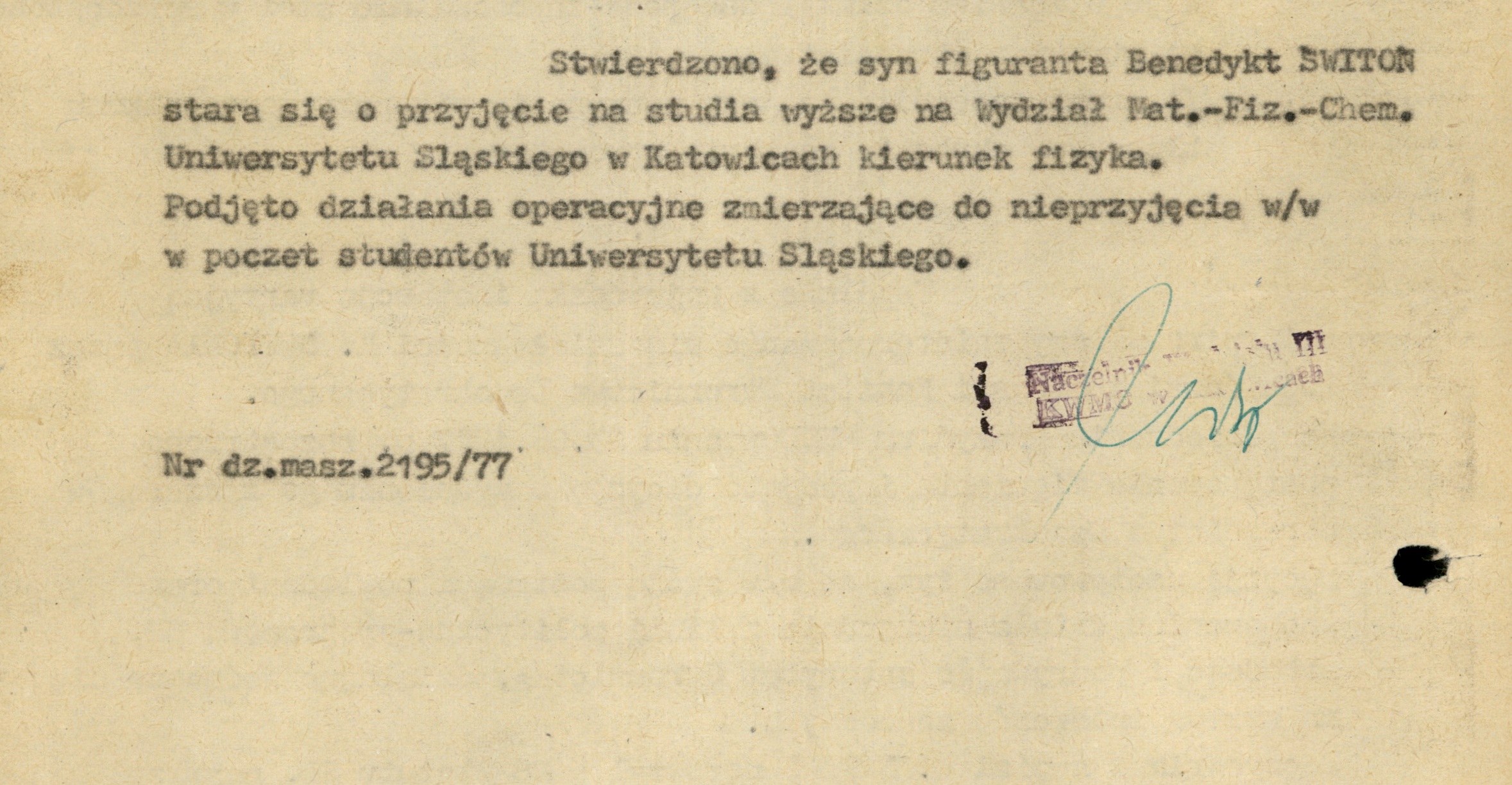 Fragment meldunku Wydz. III KWMO Katowice z 29 VI 1977 r. dot. działań mających na celu nieprzyjęcie Benedykta Świtonia na Uniwersytet Śląski (AIPN Ka 048/916, t. 1) -
