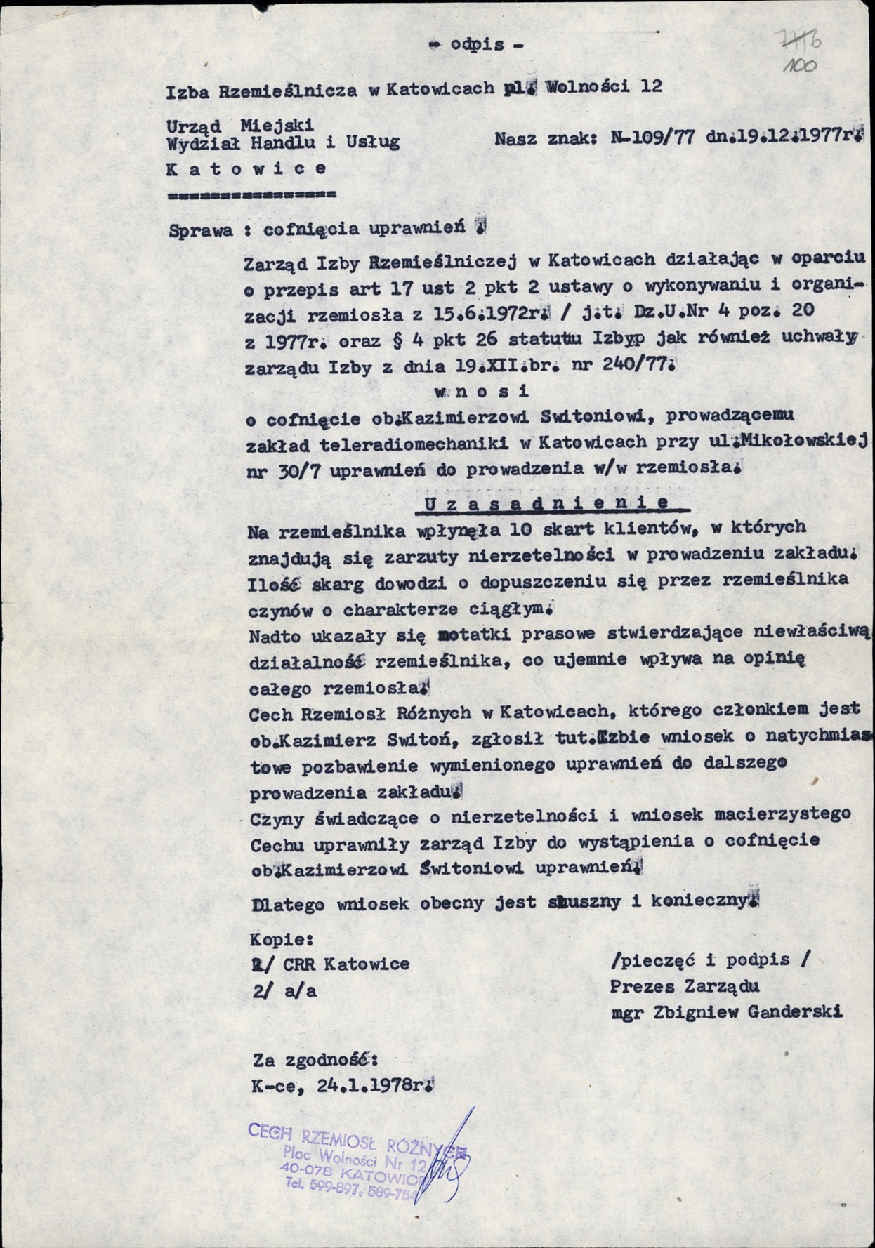 Odpis wniosku Izby Rzemieślniczej w Katowicach do UM o cofnięcie K. Świtoniowi uprawnień rzemieślniczych (AIPN Ka 048/916, t. 5) -