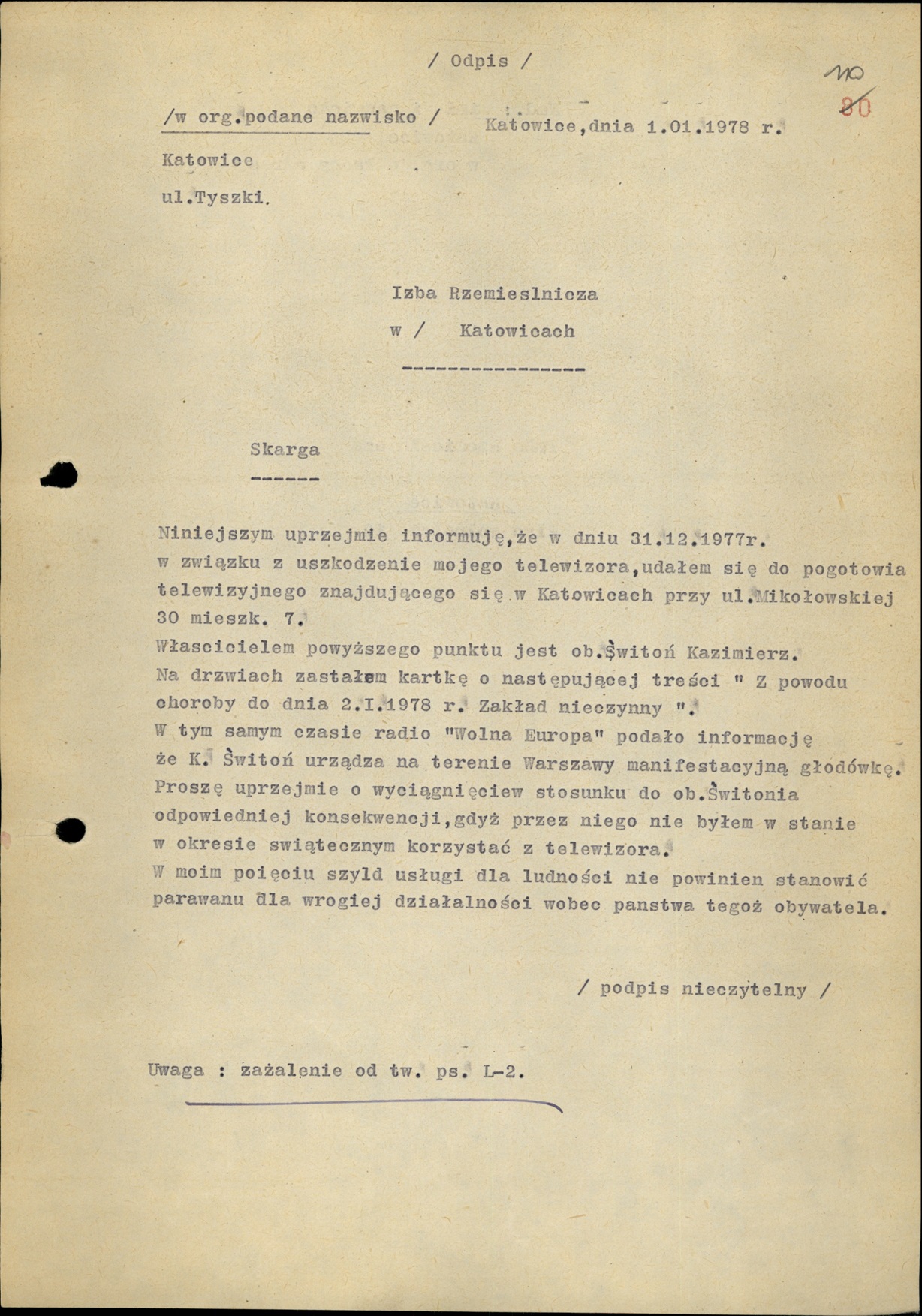 Odpis zażalenia na rzekomo złą jakość usług świadczonych przez K. Świtonia przesłane w styczniu 1978 r. przez TW „L-2” (AIPN Ka 048/916, t. 5)
