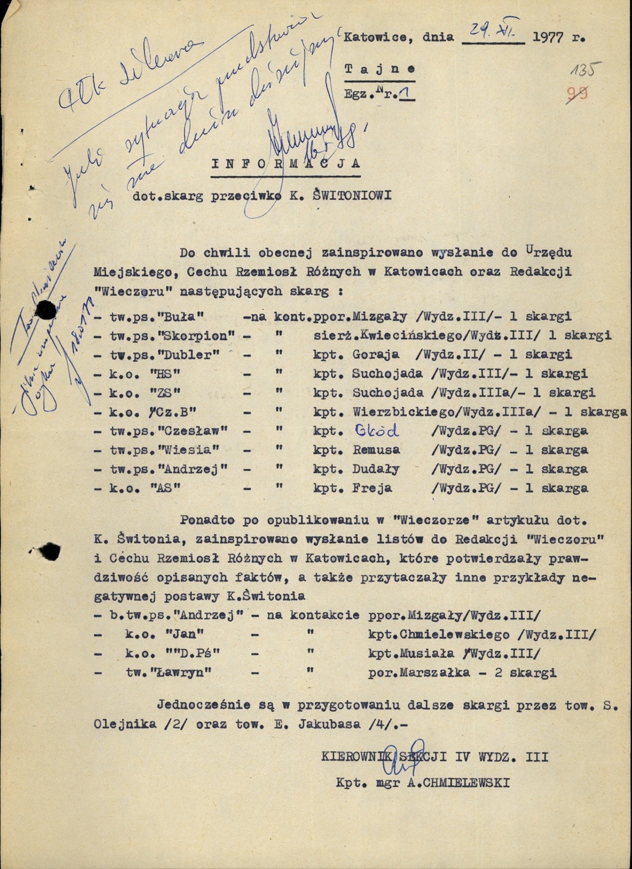 Wykaz TW, którym zlecono pisanie skarg do różnych instytucji na rzekomo złą jakość usług świadczonych przez K. Świtonia (AIPN Ka 048/916, t. 5) -