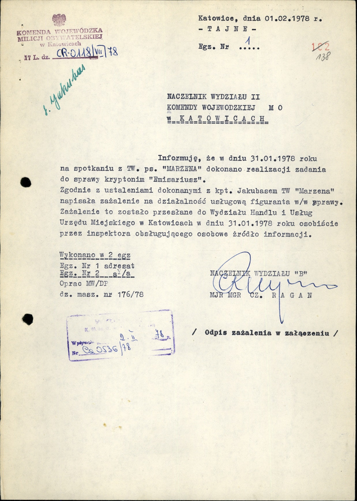 Informacja z 1 II 1978 r. o wykonaniu przez TW „Marzena” polecenia wysłania zażalenia na rzekomo złą jakość usług świadczonych przez K. Świtonia wraz z odpisem ww. zażalenia (AIPN Ka 048/916, t. 5) -