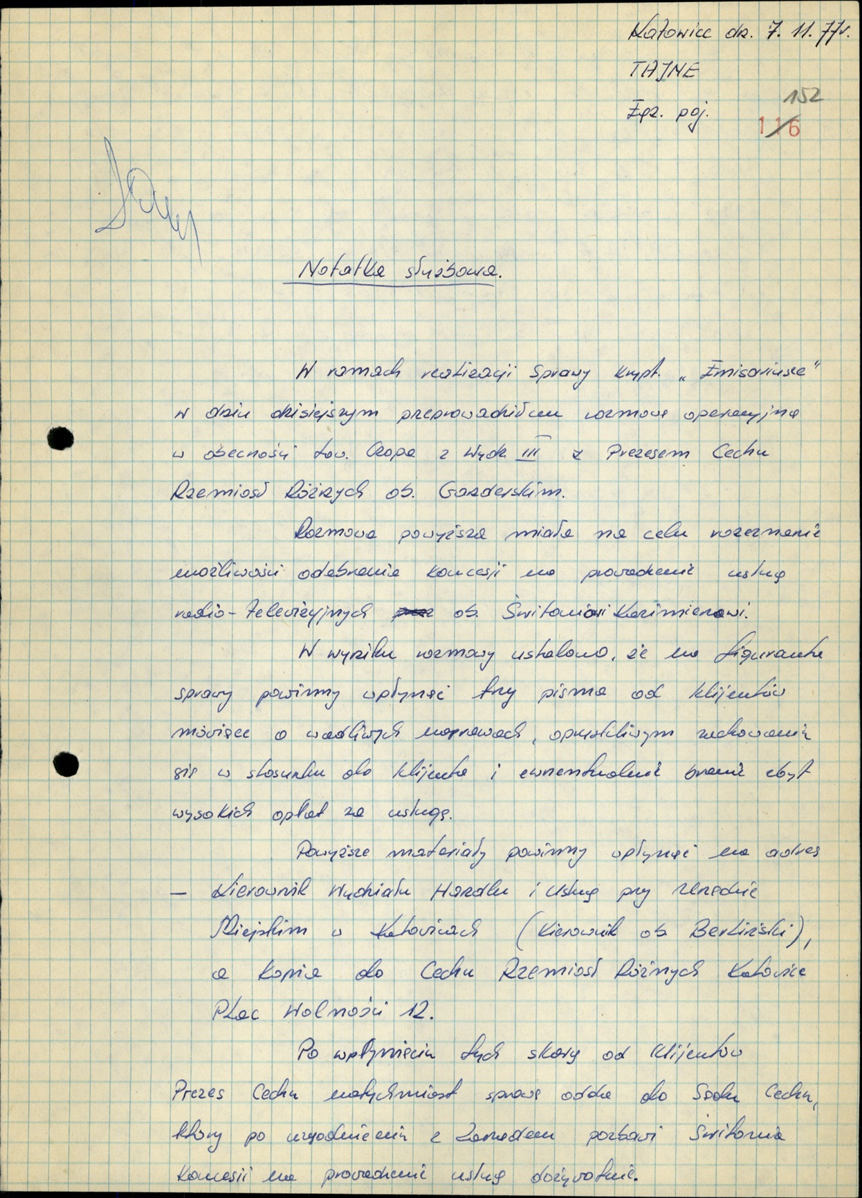 Notatka z 7 XI 1977 r. z rozmowy z prezesem Cechu Rzemiosł Zbigniewem Ganderskim/Gandorskim w sprawie możliwości odebrania koncesji K. Świtoniowi (AIPN Ka 048/916, t. 5) -