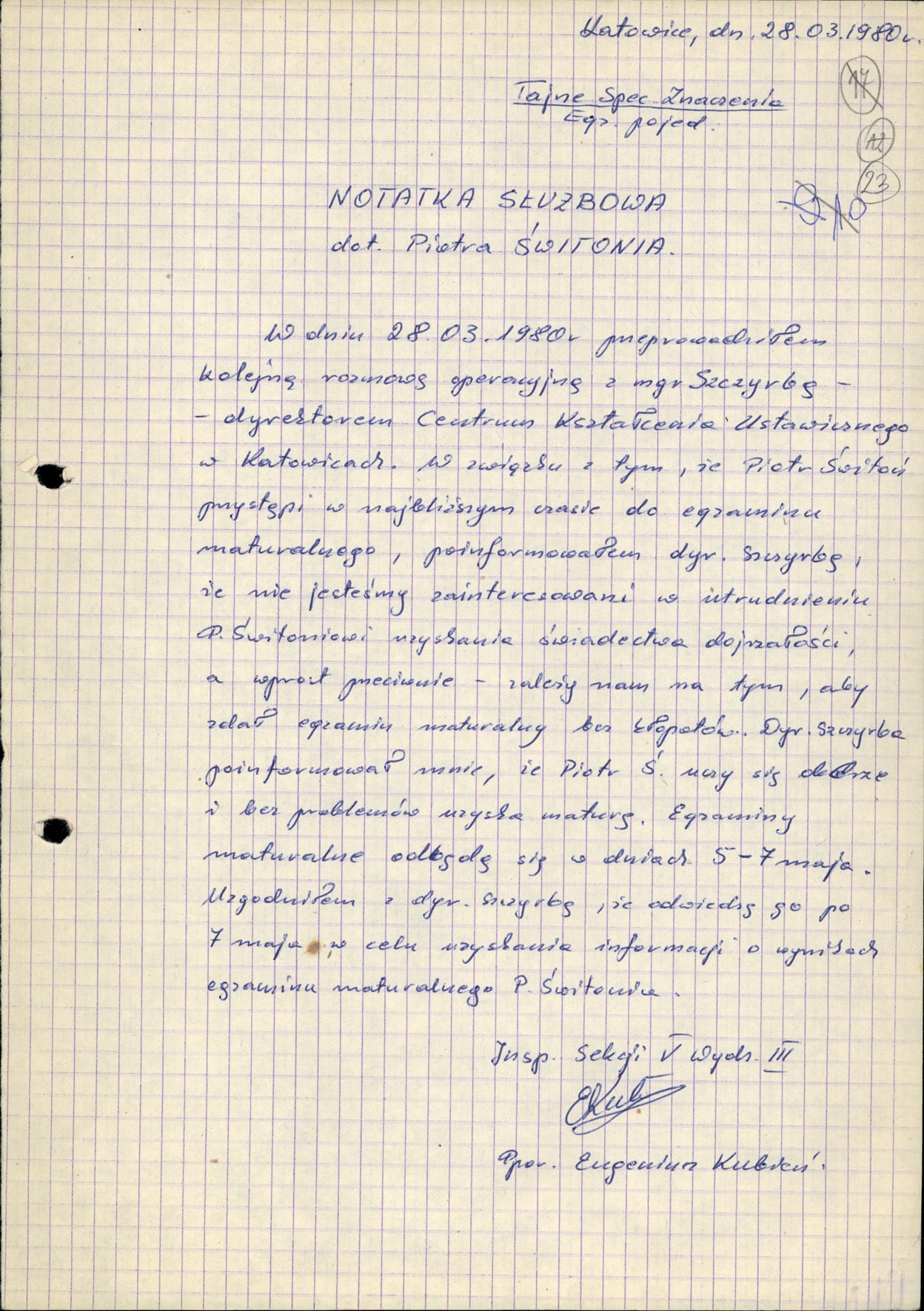 Notatka służbowa funkcjonariusza Wydz. III KWMO Katowice z 28 III 1980 r. dot. umożliwienia synowi Piotrowi zdania matury (AIPN Ka 048/916, t. 7) -