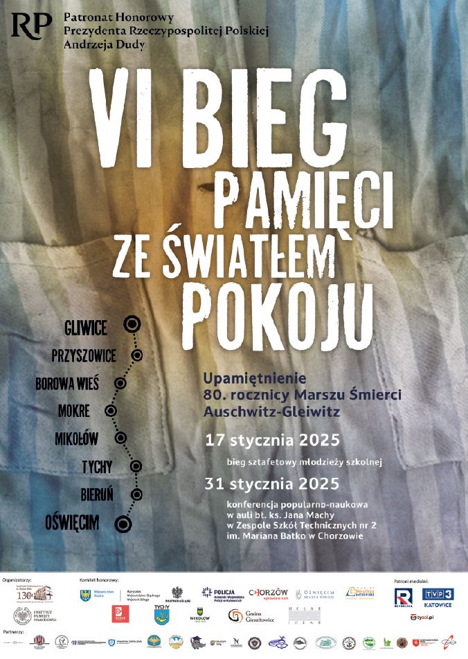 17 stycznia 1945 r. więźniowie Niemieckiego Nazistowskiego Obozu Koncentracyjnego i Zagłady Auschwitz rozpoczęli marsz, który został nazwany „Marszem Śmierci”. Jedna z jego tras prowadziła z KL Auschwitz do Gliwic. Według szacunków do pospiesznej ewakuacji w obliczu zbliżającego się frontu Niemcy zmusili 56 tysięcy więźniów KL Auschwitz oraz jego podobozów. Osiemdziesiąt lat po tym wydarzeniu trasę marszu pokona ok. 200 uczniów chorzowskich, oświęcimskich, lędzińskich, bieruńskich, tyskich, mikołowskich i przyszowickich szkół w ramach projektu VI Bieg Pamięci ze Światłem Pokoju. Inauguracja miała miejsce 17 stycznia 2025 r. pod tablicą upamiętniającą zbiorową mogiłę ostatnich ofiar KL Auschwitz. Po inauguracyjnych wystąpieniach delegacje ruszyły pod ścianę śmierci na terenie Państwowego Muzeum Auschwitz, by oddać hołd pomordowanym, a młodzież rozpoczęła bieg, łącząc pobranym światłem pokoju miejsca pamięci Marszu Śmierci, w Bieruniu, Tychach, Mikołowie, Borowej Wsi, Przyszowicach oraz Gliwicach.