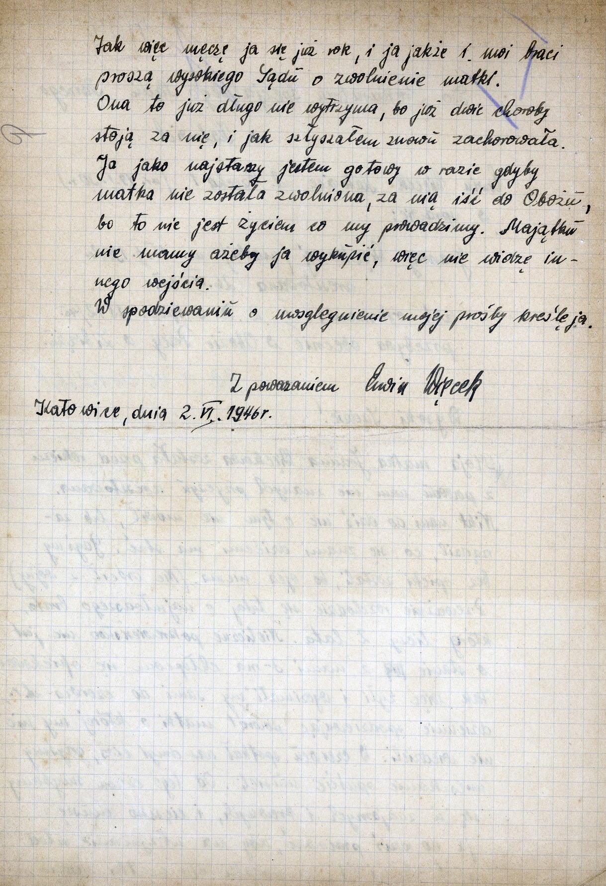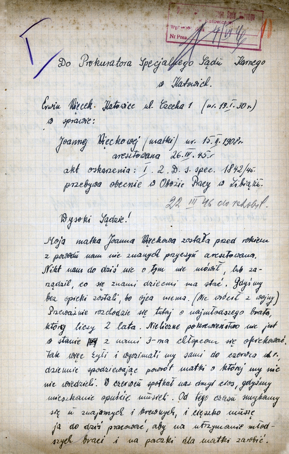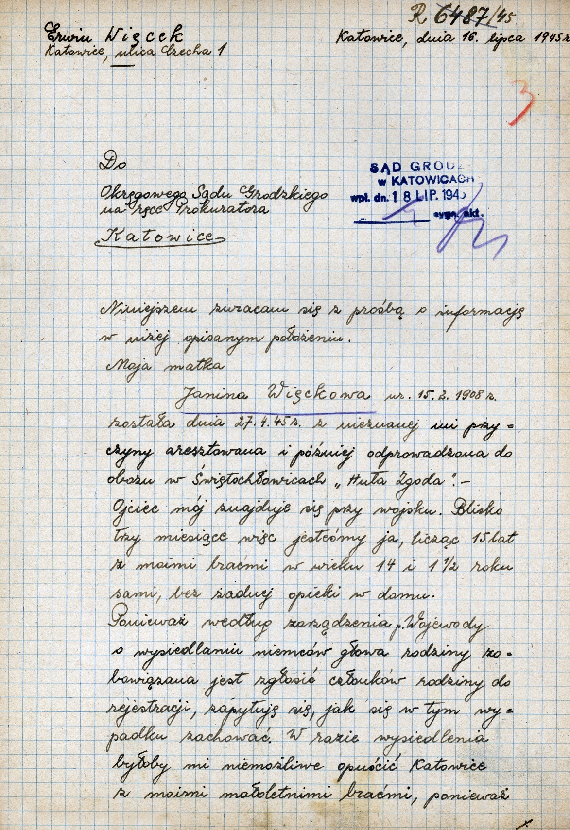Bohaterem – w znaczeniu męstwa i heroizmu – drugiej historii jest piętnastoletni w 1945 r. Erwin Więcek z Katowic. Od kwietnia jego matka Joanna z drugą grupą niemieckiej listy narodowej była więziona w obozach w Zgodzie i Libiążu, a Erwin został z dwoma braćmi: lat 14 i półtora roku. Losy ojca, najpewniej wcielonego przymusowo do Wehrmachtu, były do połowy 1946 r. nieznane. Erwin pisał pisma do władz i pytał, co ma zrobić, żeby uniknąć wysiedlenia, bo w Niemczech nikogo nie zna. Po ponad roku trudnej samodzielności skarżył się, że nieliczne pokrewieństwo nie jest się w stanie nimi zajmować, ale jakoś wytrzymali. Powalił ich kolejny cios: usunięcie z mieszkania. „Od tego czasu smykamy się u znajomych i krewnych i cięszko muszę ja do dziś pracować, aby na utrzymanie młodszych braci i na paczki dla matki zarobić” – pisał w czerwcu 1946 r. Do tego matka w obozie ciężko chorowała i chłopak przewidywał, że może niedługo umrzeć. List zakończył wzruszającą deklaracją: „Ja jako najstarszy jestem gotowy w razie gdyby matka nie została zwolniona, za nią iść do Obozu, bo to nie jest życiem, co my prowadzimy”. Pod koniec czerwca 1946 r. Joanna wyszła na wolność, wrócił też z wojny jej mąż. Rodzina została zrehabilitowana, ale jeszcze w 1948 r. szarpała się z władzami o odzyskanie odebranych mebli.