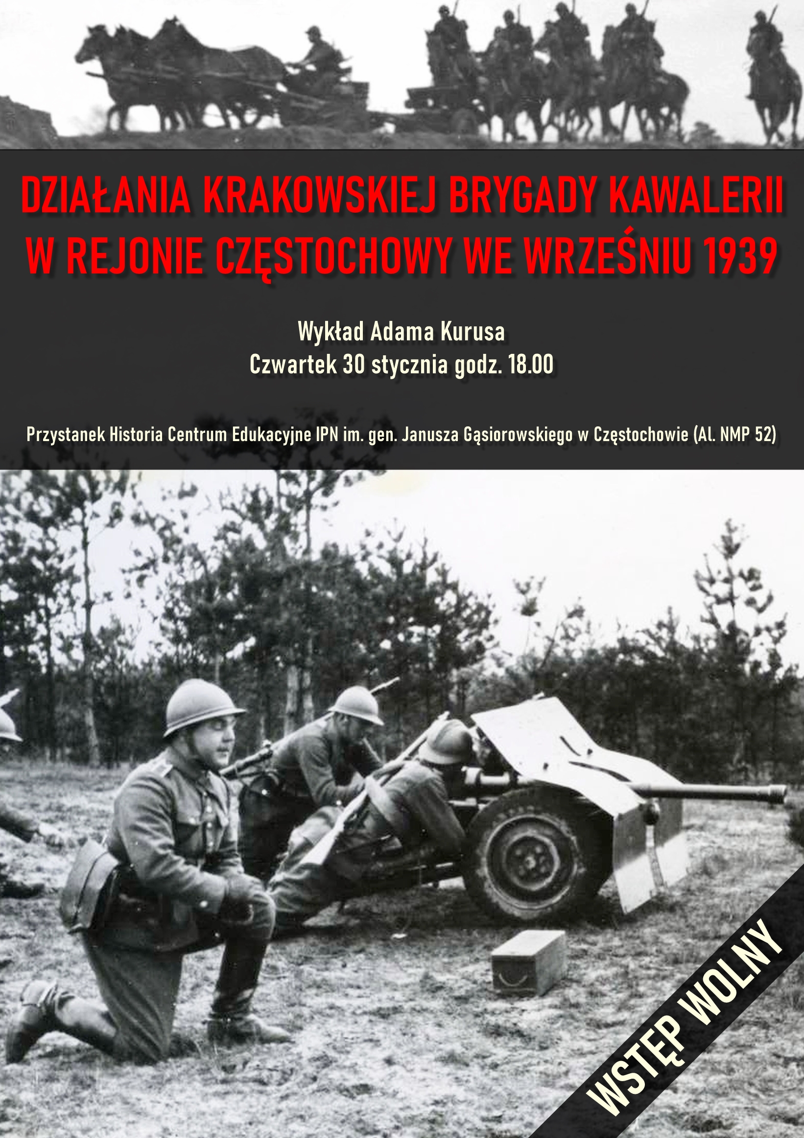 W czwartek 30 stycznia w Przystanku Historia Centrum Edukacyjnego IPN im. gen. Janusza Gąsiorowskiego w Częstochowie, przy al. Najświętszej Maryi Panny 52, odbył się wykład Adama Kurusa, historyka OBEN IPN Katowice nt. „Działania Krakowskiej Brygady Kawalerii w rejonie Częstochowy we wrześniu 1939 roku “.