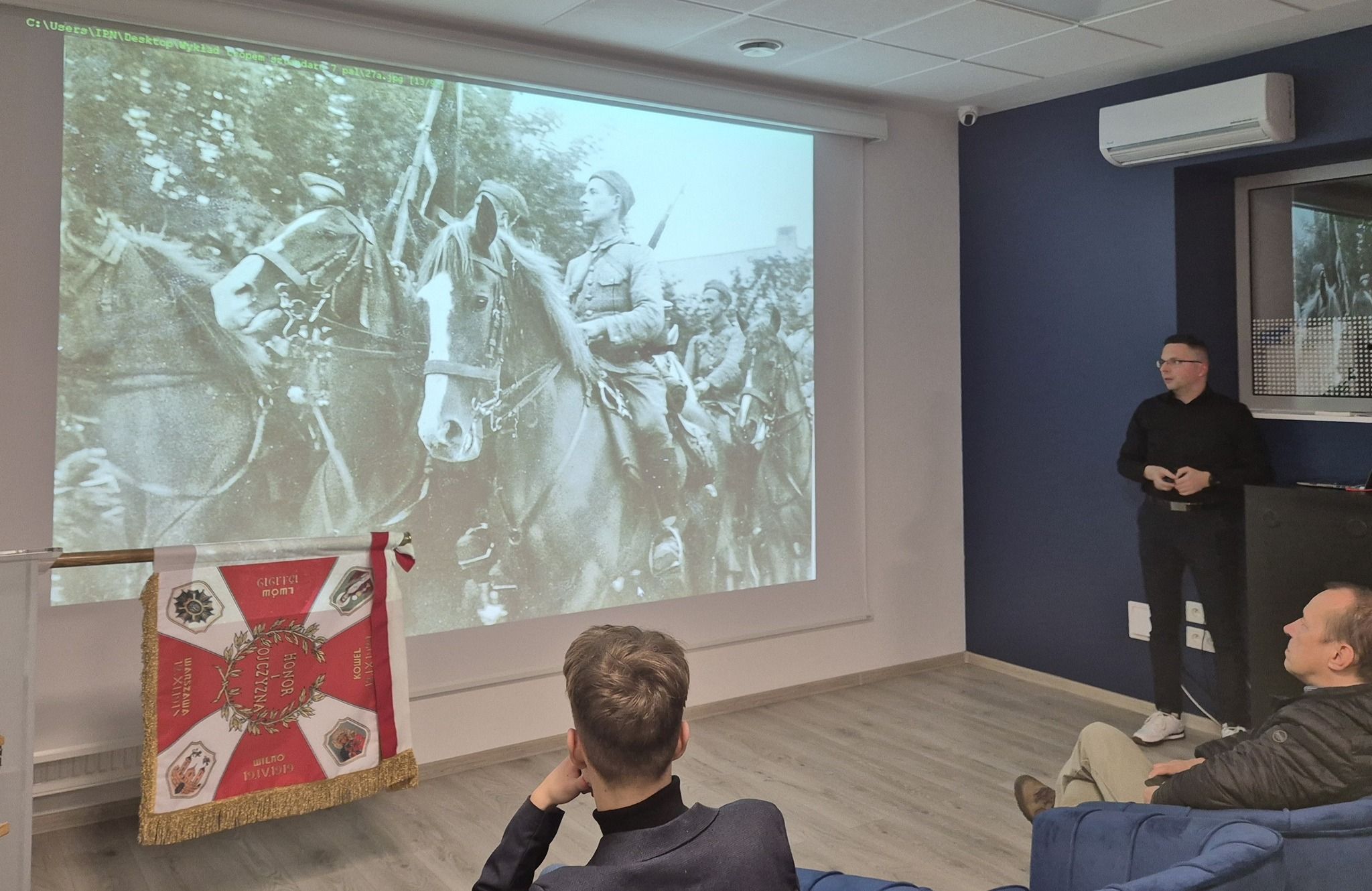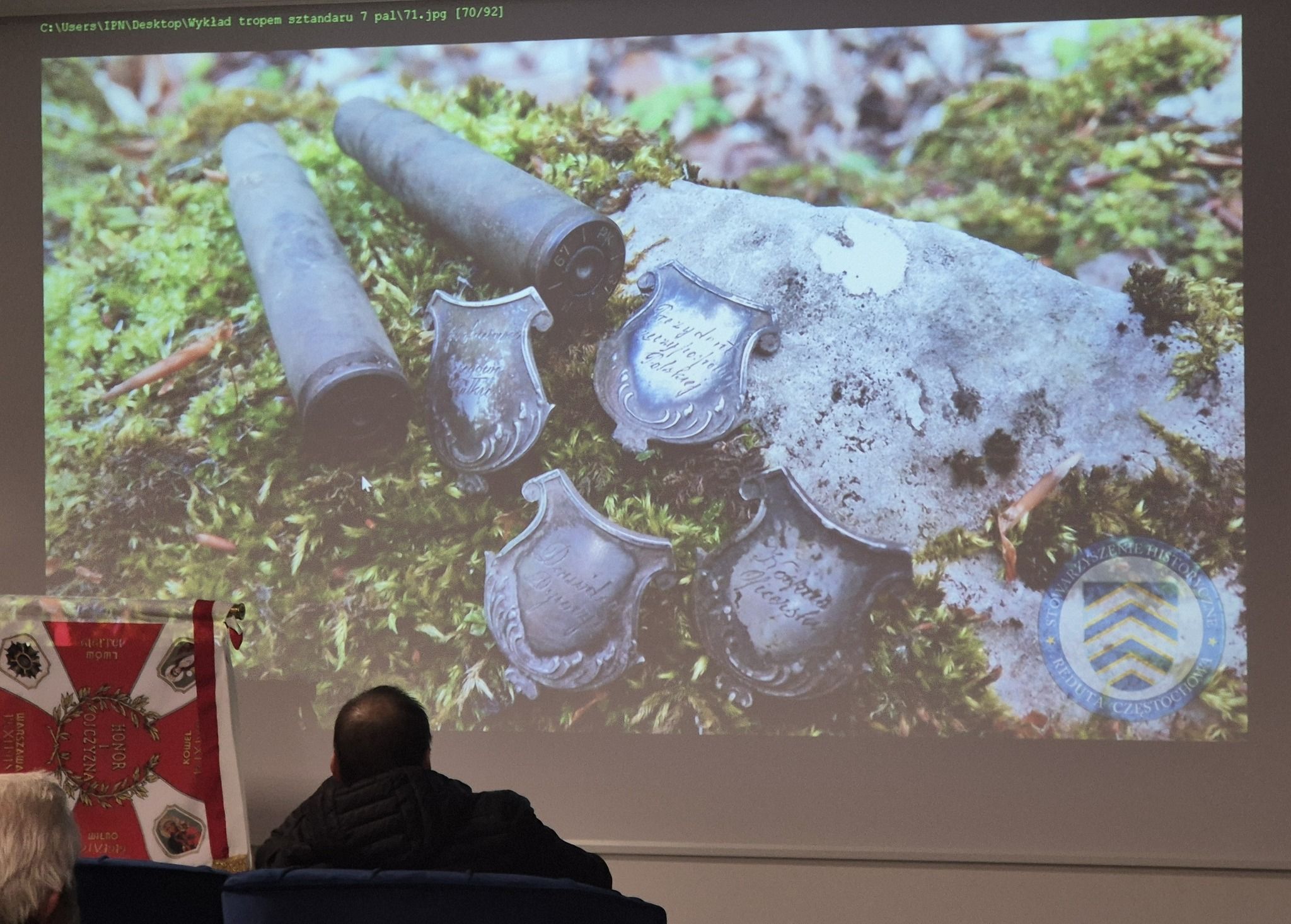 Wykładowi towarzyszyła prezentacja pełnowymiarowej repliki sztandaru 7 Pułku Artylerii Lekkiej ze zbiorów Muzeum Regionalnego im. Zygmunta Krasińskiego w Złotym Potoku oraz pokaz archiwalnego filmu dokumentalnego poświęconego poszukiwaniom sztandaru w 2010 roku.