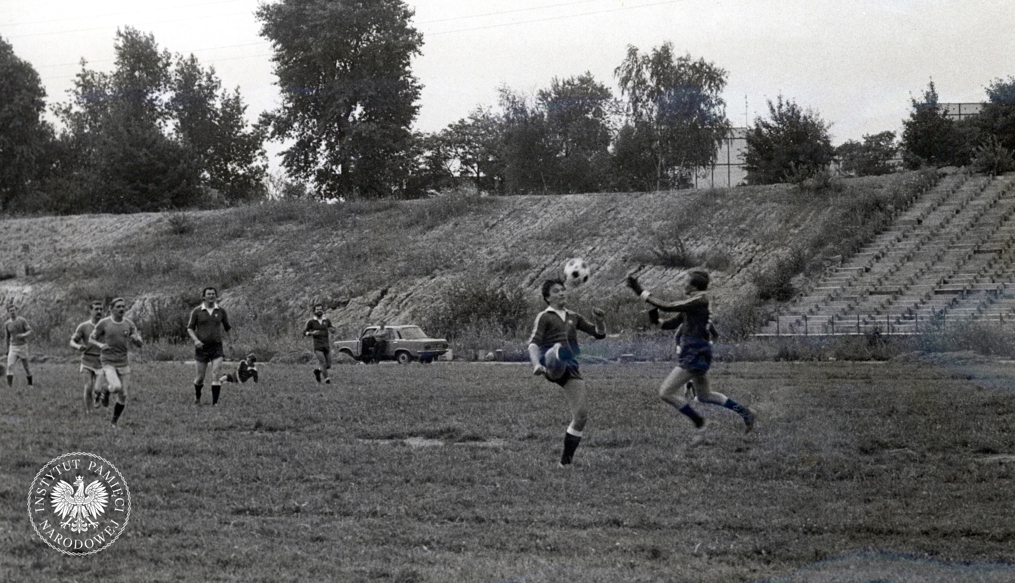 „Sympatyczna impreza” – czyli letni festyn sportowy dla funkcjonariuszy i ich rodzin (jak widać, przy pełnych trybunach ;-)). Mecz rozgrywa reprezentacja Komitetu Zakładowego PZPR w WUSW z ekipą zarządu międzyzakładowego ZSMP, która wygrała; 1985 r. (IPN Ka 425/116) -