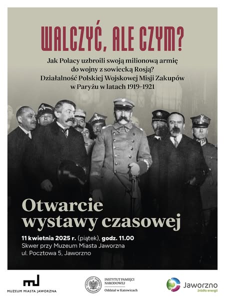 W piątek 11 kwietnia 2025 r. o godz. 11.00 na skwerze przy Muzeum Miasta Jaworzna (ul. Pocztowa/Rynek) odbyło się otwarcie wystawy „Walczyć, ale czym? Jak Polacy uzbroili swoją milionową armię do wojny z sowiecką Rosją? Polska Wojskowa Misja Zakupów w Paryżu w latach 1919–1921”. Wystawa została przygotowana przez Oddział Instytutu Pamięci Narodowej w Katowicach i Muzeum Miasta Jaworzna.