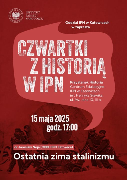 15 maja 2025 r. w Przystanku Historia Centrum Edukacyjnym IPN w Katowicach im. Henryka Sławika przy ul. św. Jana 10 (III piętro) odbyło się kolejne spotkanie w ramach projektu „Czwartki z historią”. Naszym gościem był dr Jarosław Neja (OBBH IPN Katowice), który opowiedział o ostatniej zimie stalinizmu.