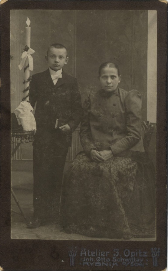 Fotografia komunijna Pawła Kożucha (ur. 1899 r.). Zdjęcie wykonano zapewne w pierwszej dekadzie XX wieku w atelier Opitz w Rybniku (IPN Ka 454/192, t. 6) -
