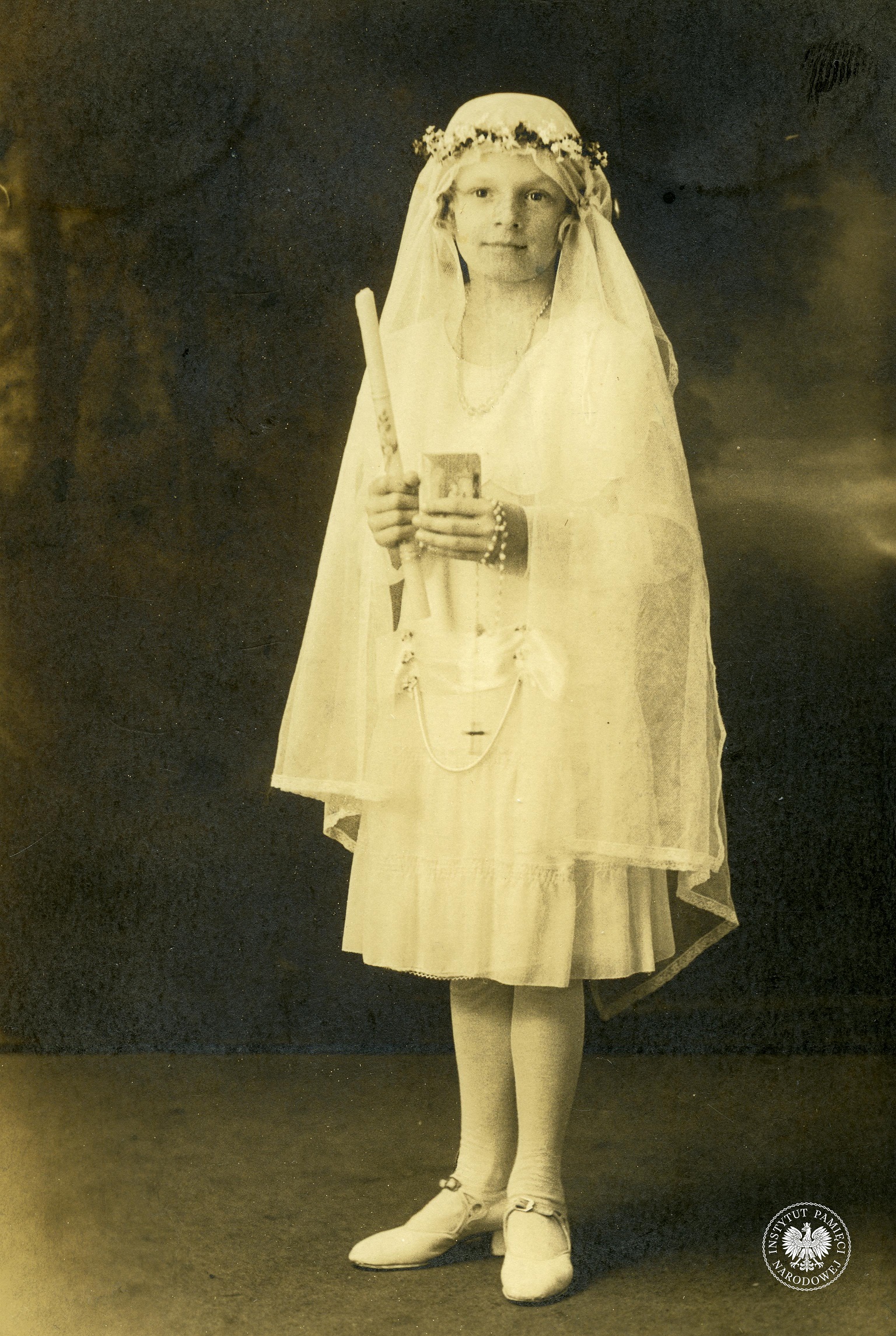 Fotografia komunijna nieznanej dziewczynki. Zdjęcie pochodzi ze zbioru dokumentów dot. rodziny Chrzanowskich, wykonano je prawdopodobnie przed II wojną światową, autor nieznany (IPN Ka 454/79, t. 3) -