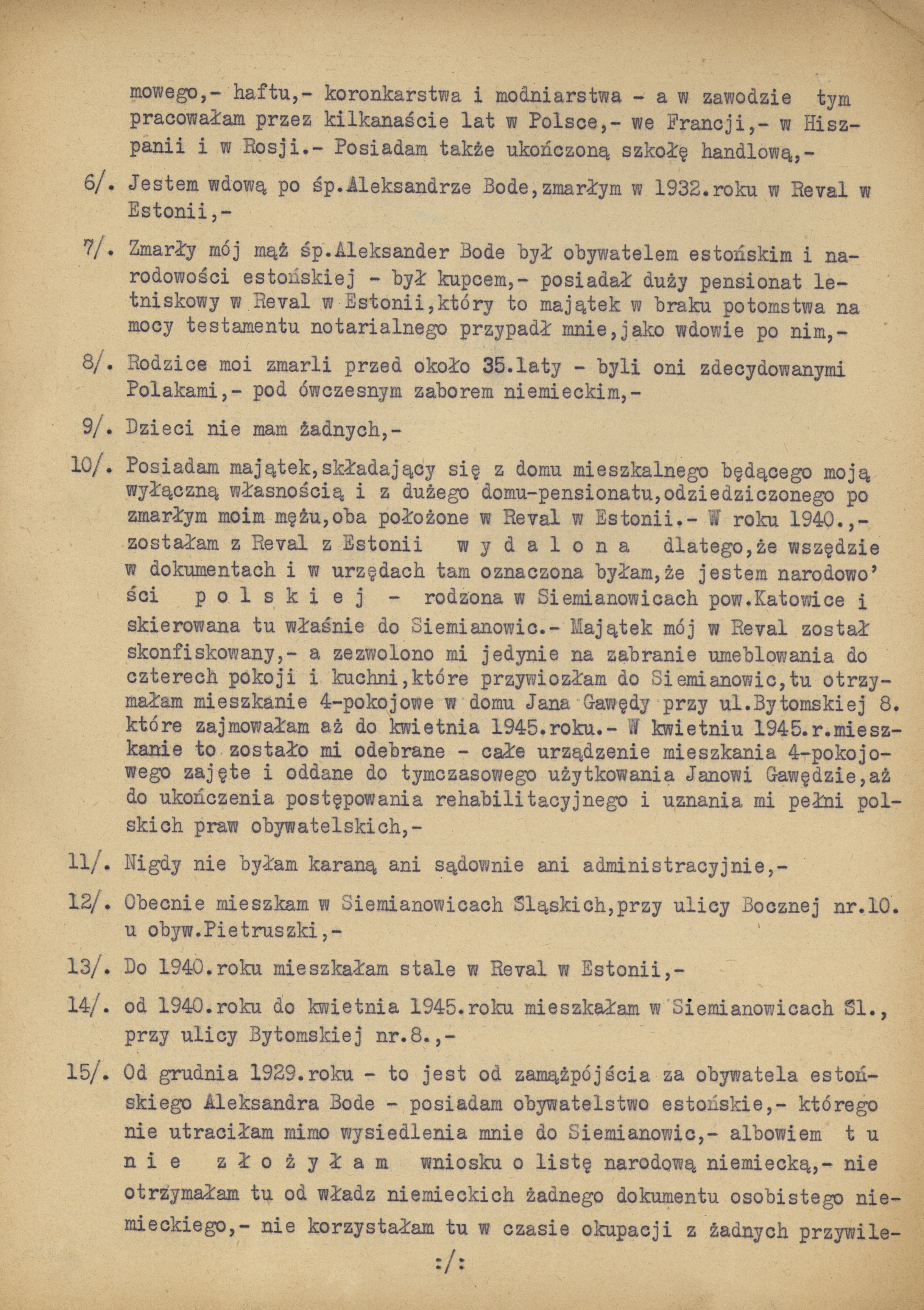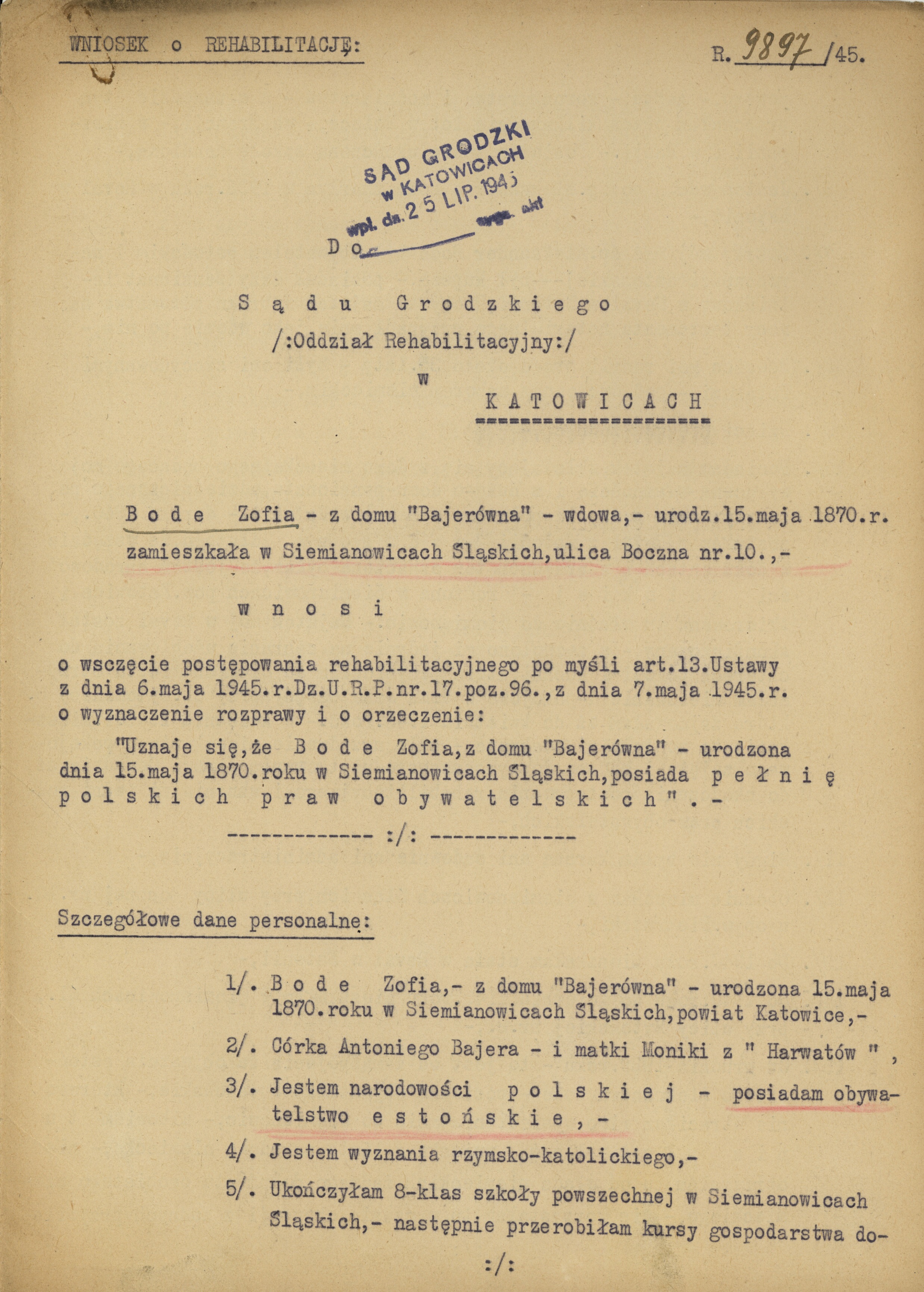 Życiorys Zofii Bode z jej akt rehabilitacyjnych, lipiec 1945 r. (IPN Ka 116/1650) -