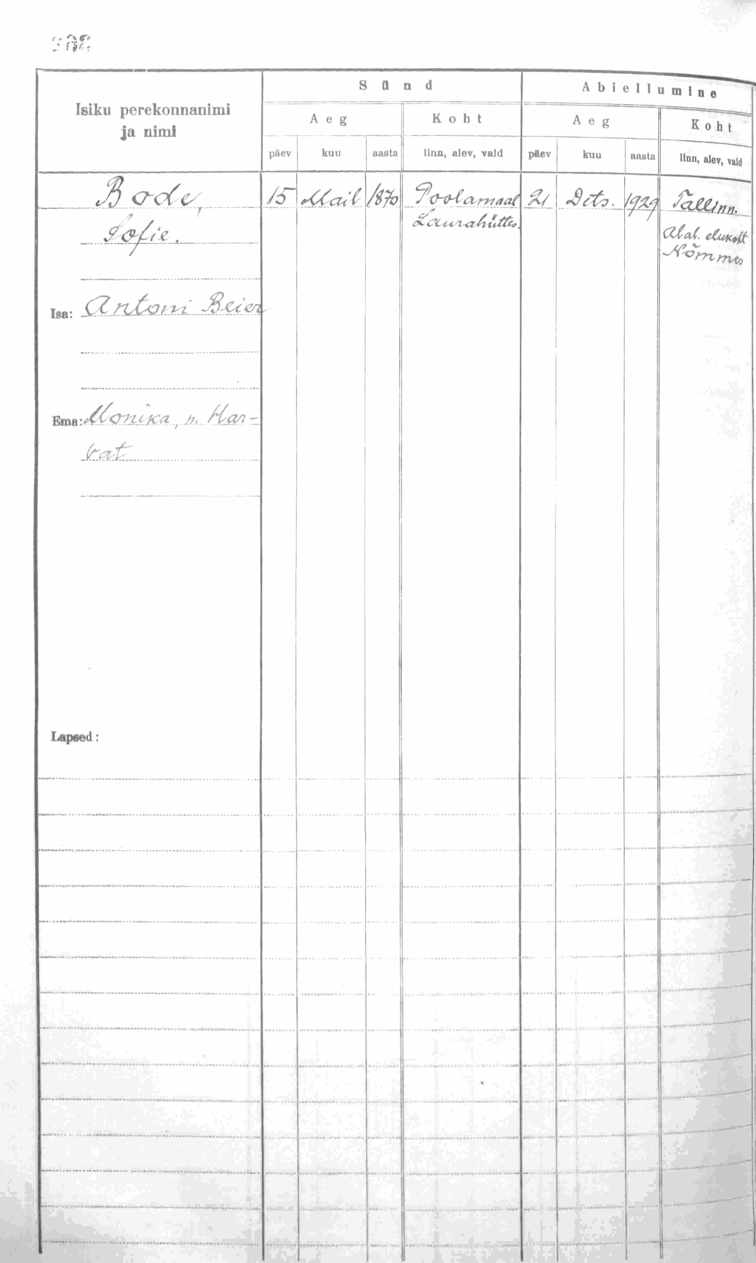 Jako się rzekło, urodziła się w Siemianowicach (wtedy Laurahütte) 15 maja 1870 r., w rodzinie Antoniego i Moniki Bajer. Została ochrzczona w obrządku katolickim, ukończyła niemiecką szkołę powszechną (innych szkół nie było; pamiętajmy, że jesteśmy w czasie niewiele po zjednoczeniu Niemiec, a Polski nie ma). Potem jeszcze uczyła się w szkole handlowej oraz na kursach gospodarstwa domowego, haftu, koronkarstwa i modniarstwa. Trzeba zaznaczyć, że tak szerokie wykształcenie młodej dziewczyny z peryferii pod koniec XIX wieku było czymś raczej niespotykanym – ale i Zofia chyba do przeciętnych nie należała. Utrzymywała się z prac ręcznych, których wyuczyła się na wspomnianych kursach. Była wyjątkowo mobilna: pracowała w Polsce (miała pewnie na myśli ziemie polskie pod zaborami), we Francji, Hiszpanii i Rosji. W 1905 r. osiedliła się w rosyjskim wtedy Tallinie jako niemiecka obywatelka. Podczas I wojny przebywała gdzieś w Rosji, a w 1918 r. wróciła do Tallina (w latach 1918–1920 Estonia skutecznie wywalczyła niepodległość). 21 grudnia 1929 r. wyszła za mąż za Davida Alexandra Voldemara Bode i w ten sposób uzyskała estońskie obywatelstwo.
