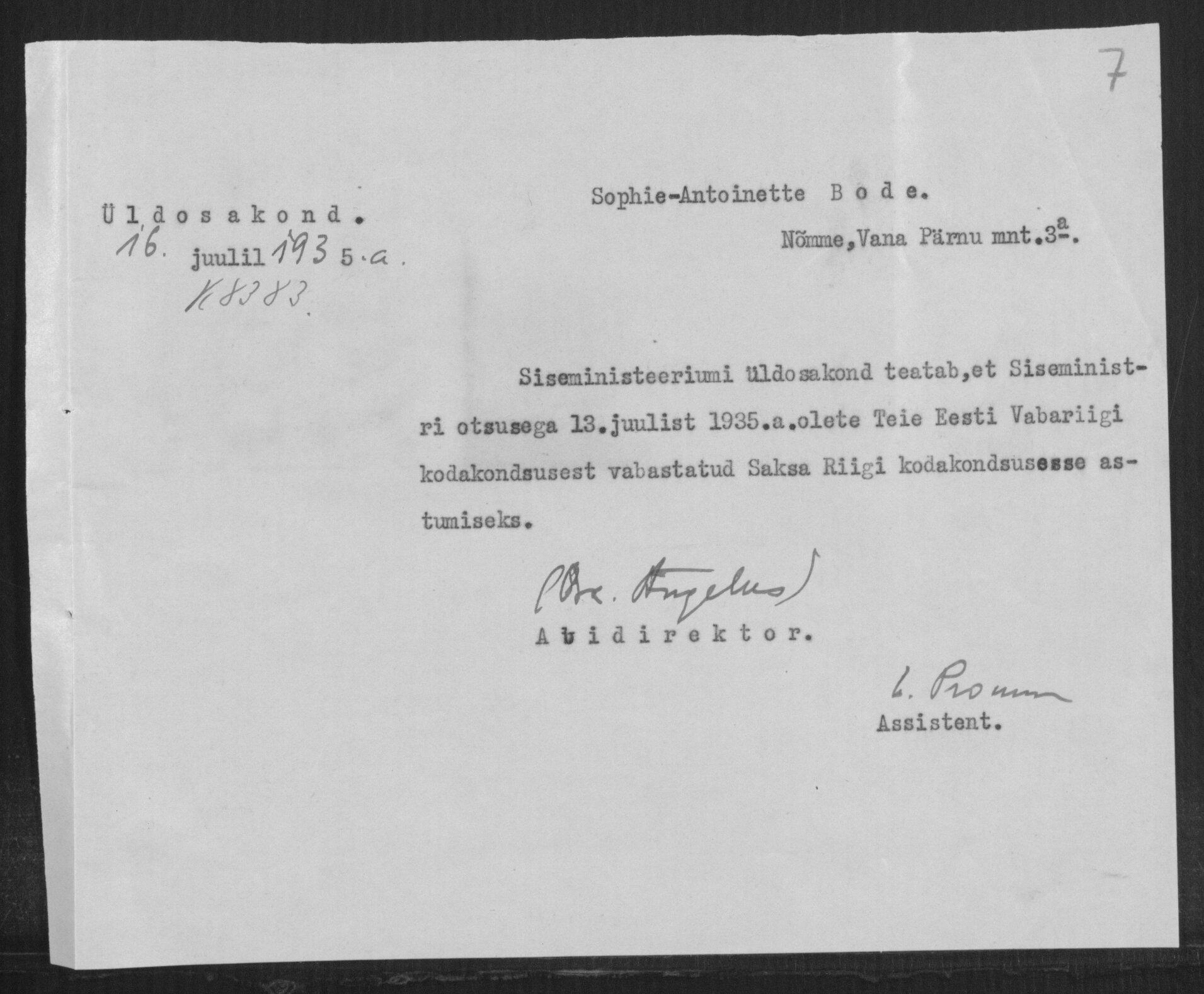 Pismo departamentu Spraw Zagranicznych MSW Estonii zwalniające Zofię Bode z estońskiego obywatelstwa, lipiec 1935 r. (ERA.14.12.1642)