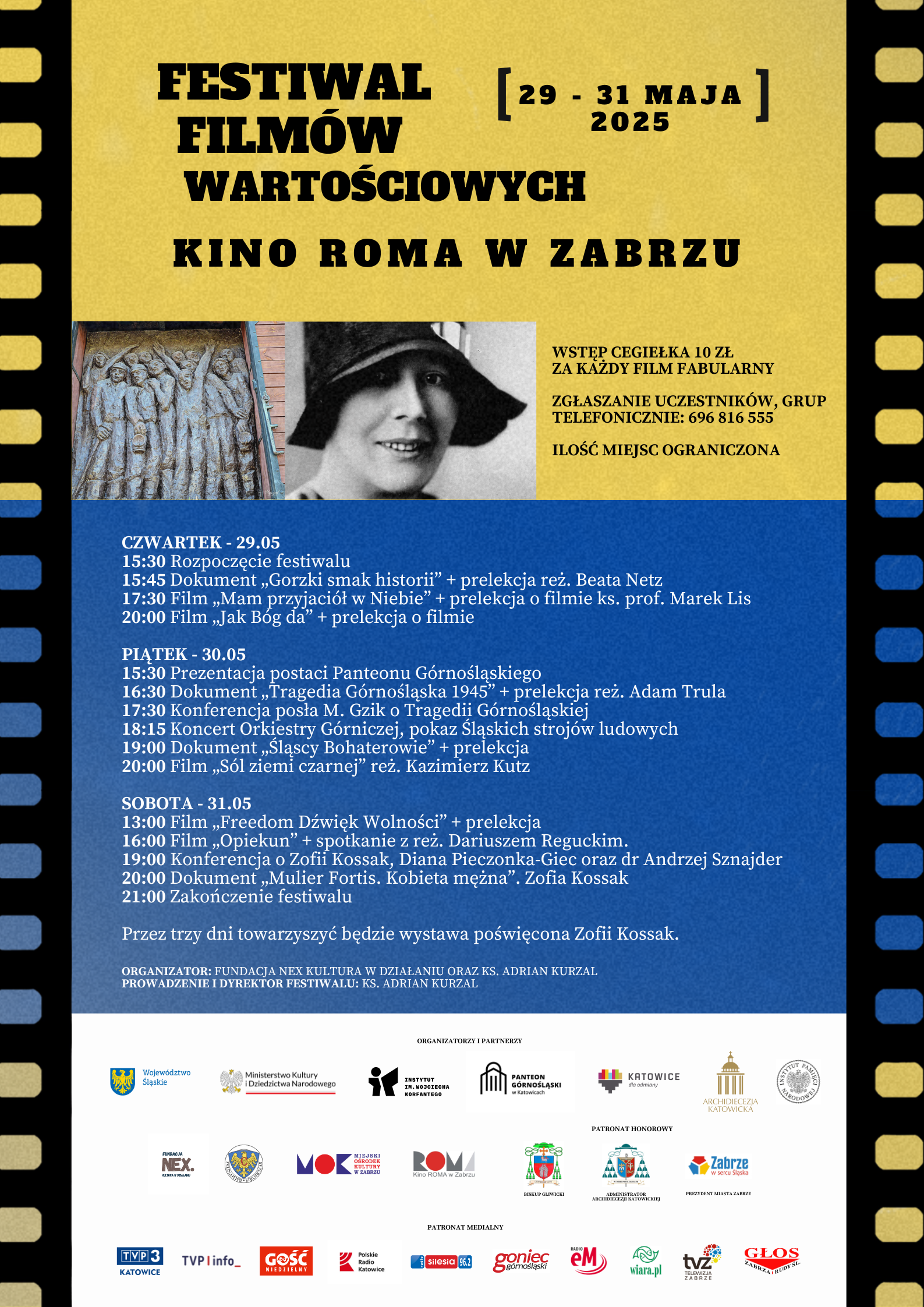 W dniach od 29 do 31 maja 2025 r. w Kinie Roma w Zabrzu odbył się Festiwal Filmów Wartościowych. W programie festiwalu m.in. 31 maja 2025 r., o godz. 20.00 pokaz filmu dokumentalnego „Mulier fortis. Kobieta mężna“ w reż. Adama Kraśnickiego. Przed filmem o godz. 19.00 miała miejsce dyskusja o Zofii Kossak z udziałem dr. Andrzeja Sznajdera, dyrektora Oddziału IPN w Katowicach oraz Diany Pieczonki-Giec, kierownik Muzeum Zofii Kossak-Szatkowskiej w Górkach Wielkich.