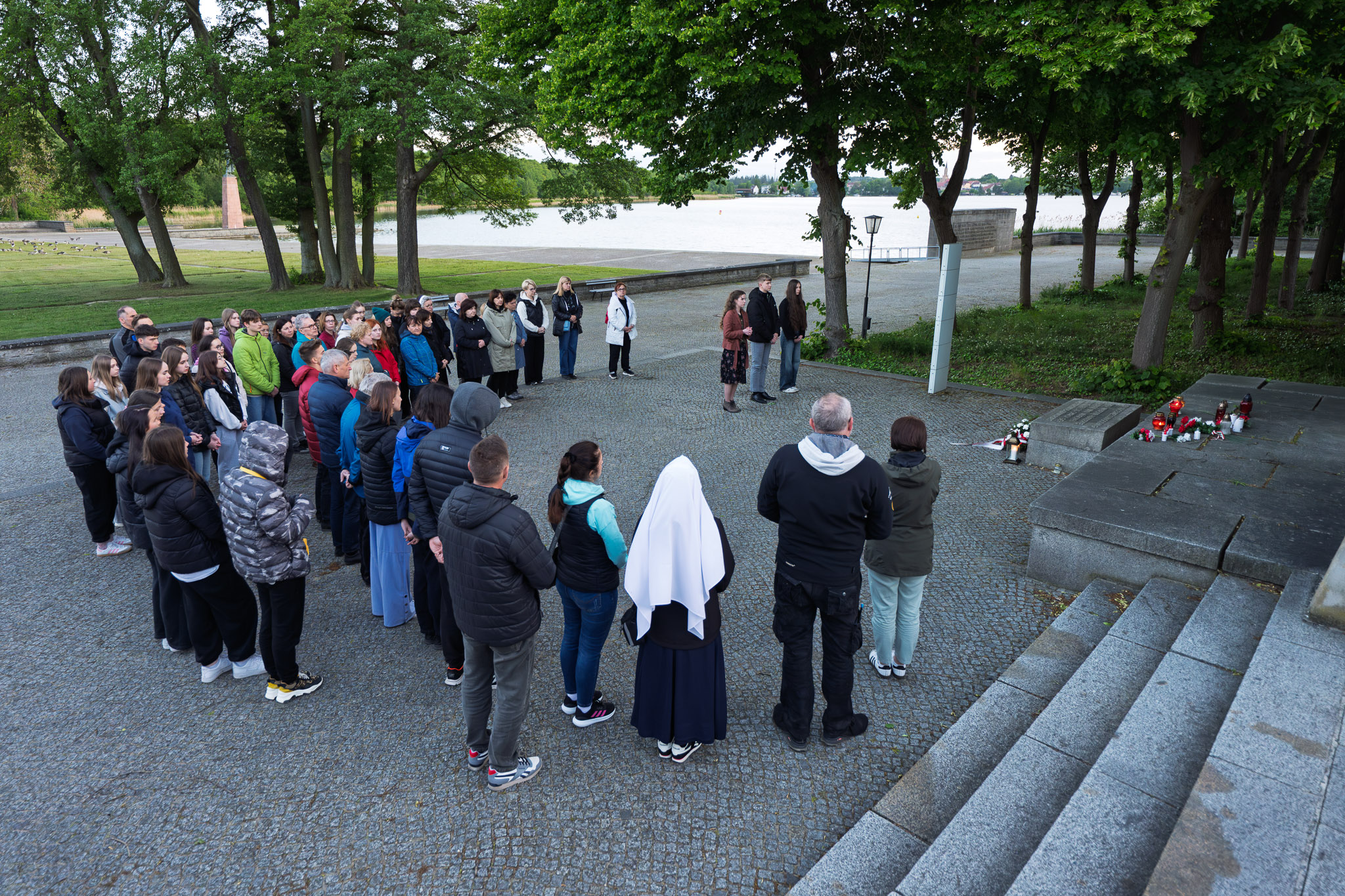 Zgodnie z tradycją naszych wypraw do tego miejsca bólu, rozpoczęliśmy od złożenia hołdu więźniarkom KL Ravensbrück – duszom, które w mroku obozu tkały nadzieję z nici odwagi. Przy Totengang – Przejściu Zmarłych, gdzie ziemia wciąż pamięta ich ostatnie chwile, a wiatr niesie echo niewypowiedzianych słów, złożyliśmy wiązankę biało-czerwonych kwiatów. Zapłonęły znicze, rzucając ciepłe światło na mrok przeszłości. Wśród szumiących drzew nad jeziorem Schwedt, którego fale wciąż tulą prochy pomordowanych, odmówiliśmy modlitwę. Ich imiona, choć niewypowiedziane, rozbrzmiewały w sercach, łącząc nas z tymi, które odeszły.