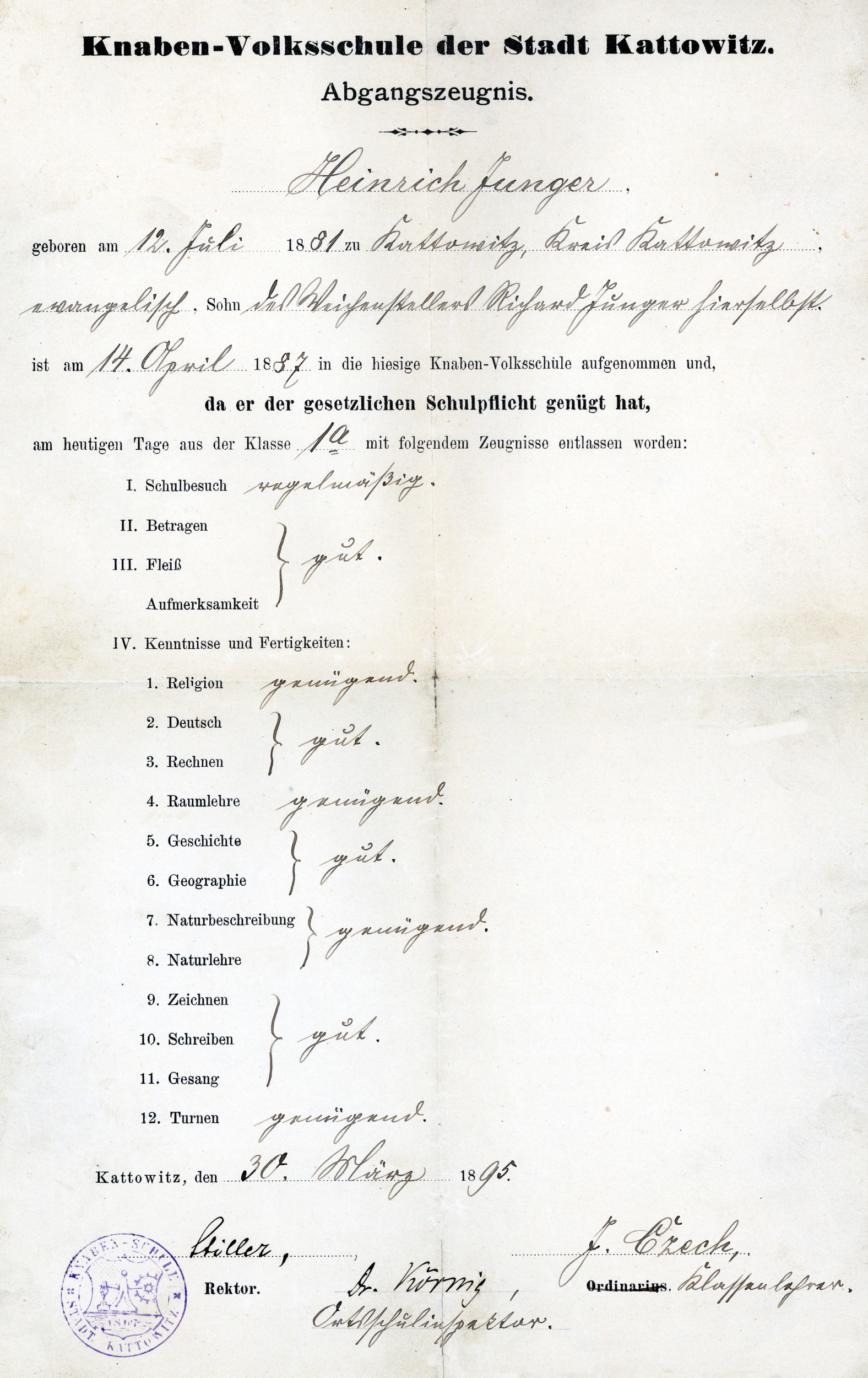 Świadectwo ukończenia szkoły powszechnej dla chłopców w Katowicach, wystawione Heinrichowi Jungerowi w 1895 r. Kolejne pokolenia Jungerów były związane z Katowicami do połowy lat sześćdziesiątych XX w. Ze świadectwa wynika, że Henryk uczęszczał na zajęcia regularnie, zachowywał się dobrze i był pilnym uczniem. Oceny dobre uzyskał z języka niemieckiego, rachunków, historii, geografii, rysunków, pisania i śpiewu, a dostateczne – z religii, geometrii, przyrody i gimnastyki. Świadectwo podpisał dyre -