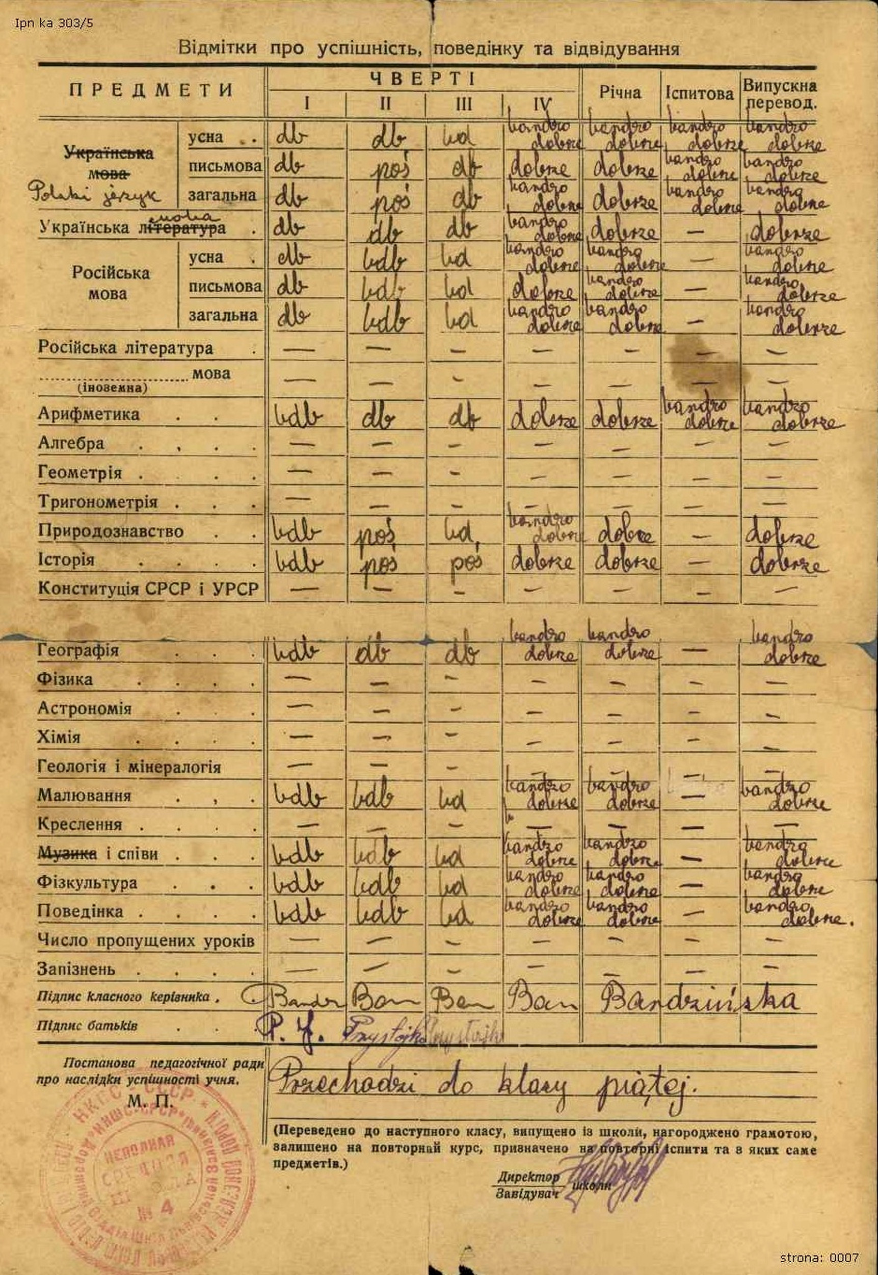 Świadectwo Emilii Przystajko ze Lwowa za rok 1940/41. Lwów po rozbiorze Polski w 1939 r. pomiędzy III Rzeszę a ZSRS przypadł temu drugiemu, a dokładnie Ukraińskiej Socjalistycznej Republice Radzieckiej. Po rozpoczęciu wojny niemiecko-sowieckiej został włączony do Generalnego Gubernatorstwa. Dokument jest wystawiony w języku ukraińskim (IPN Ka 303/5) -