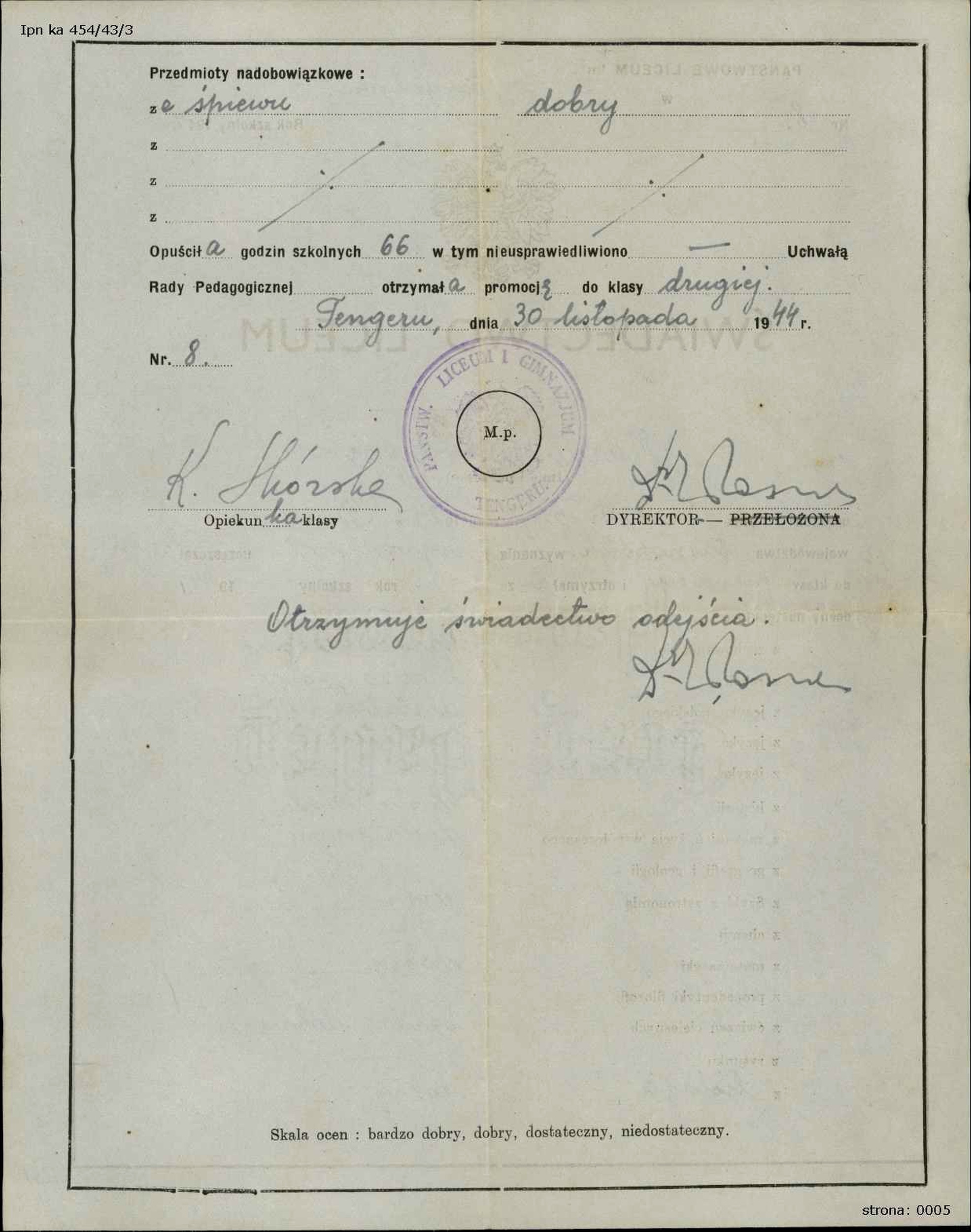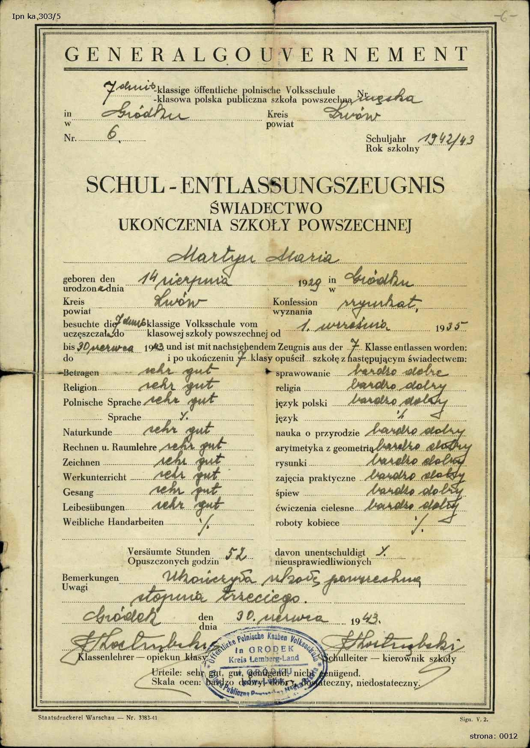 Świadectwo Marii Martyn z Gródka Jagiellońskiego za rok 1942/43, a więc z okresu, gdy Gródek został wcielony do Generalnego Gubernatorstwa (IPN Ka 303/5) -