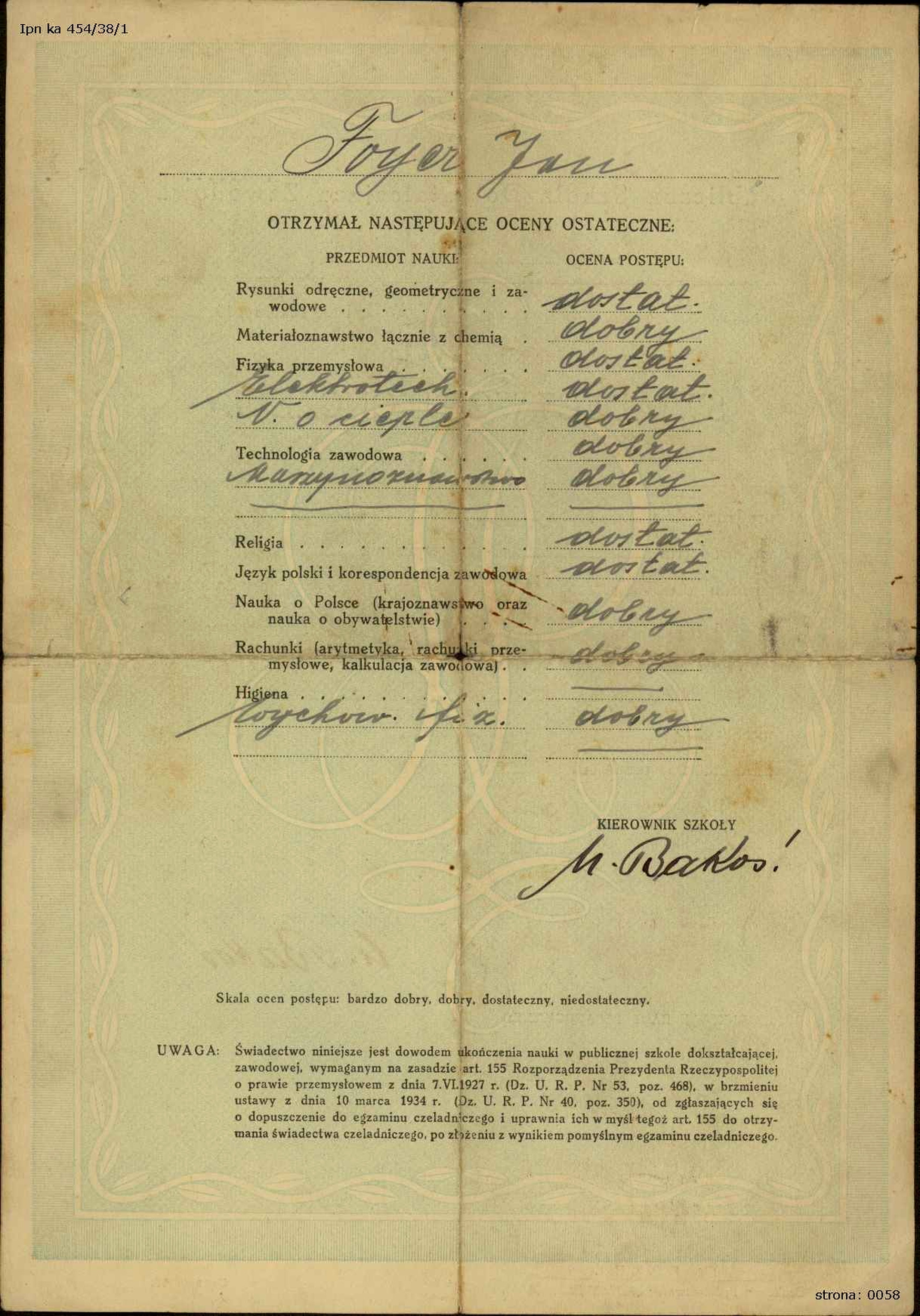 Świadectwo ukończenia przez Jana Foyer zawodowej szkoły dokształcającej w Katowicach w 1937 r. Jan Foyer urodził się w Gliwicach, ale przypuszczalnie po 1922 r. jego rodzina przeniosła się na polską stronę, do Katowic. W czasie II wojny Jan przymusowo pracował w kopalni w Niemczech, a po wojnie wyemigrował do Wielkiej Brytanii, gdzie założył rodzinę IPN Ka 454/38, t. 1) -