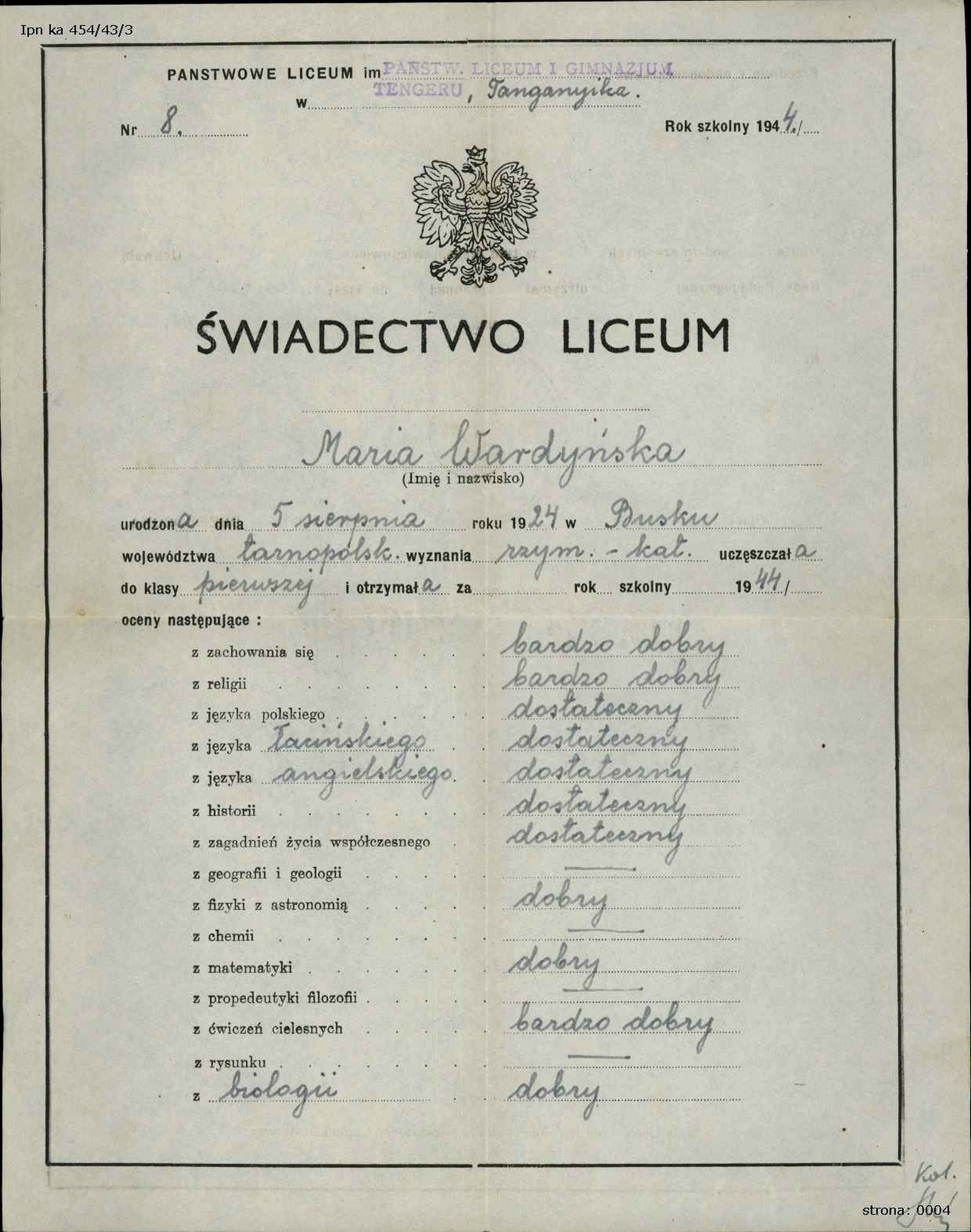 Świadectwo Marii Wardyńskiej z okresu pobytu rodziny w Tengeru w dzisiejszej Tanzanii. Tam Wardyńscy spędzili pięć lat, po czym na stałe wyjechali do Australii (IPN Ka 454/43, t. 3) -