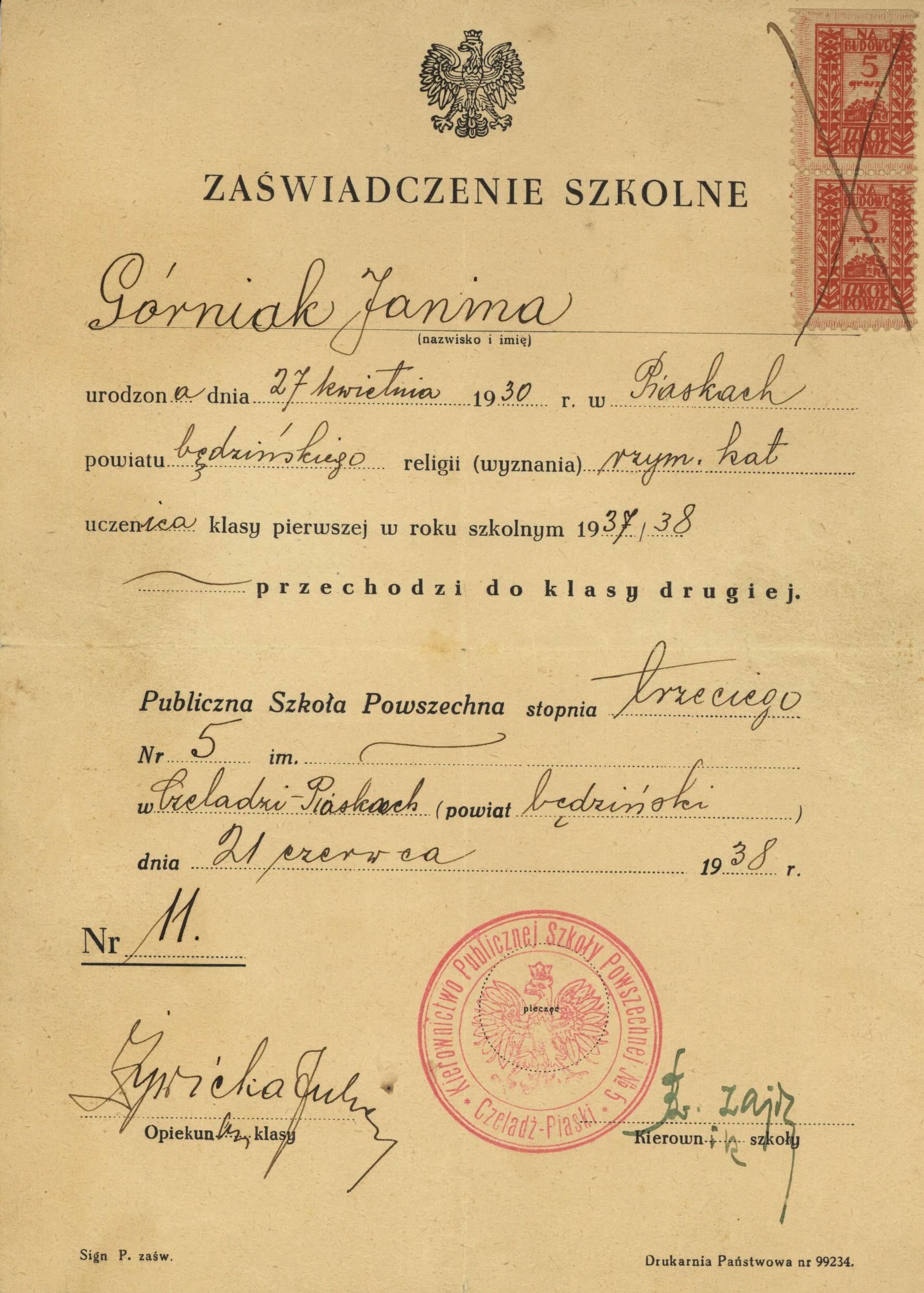 Świadectwo ukończenia pierwszej klasy przez Janinę Górniak z Czeladzi-Piasków w roku 1937/38. Rodzina Górniaków związana był z Zagłębiem Dąbrowskim i górnictwem (IPN Ka 454/205, t. 1) -