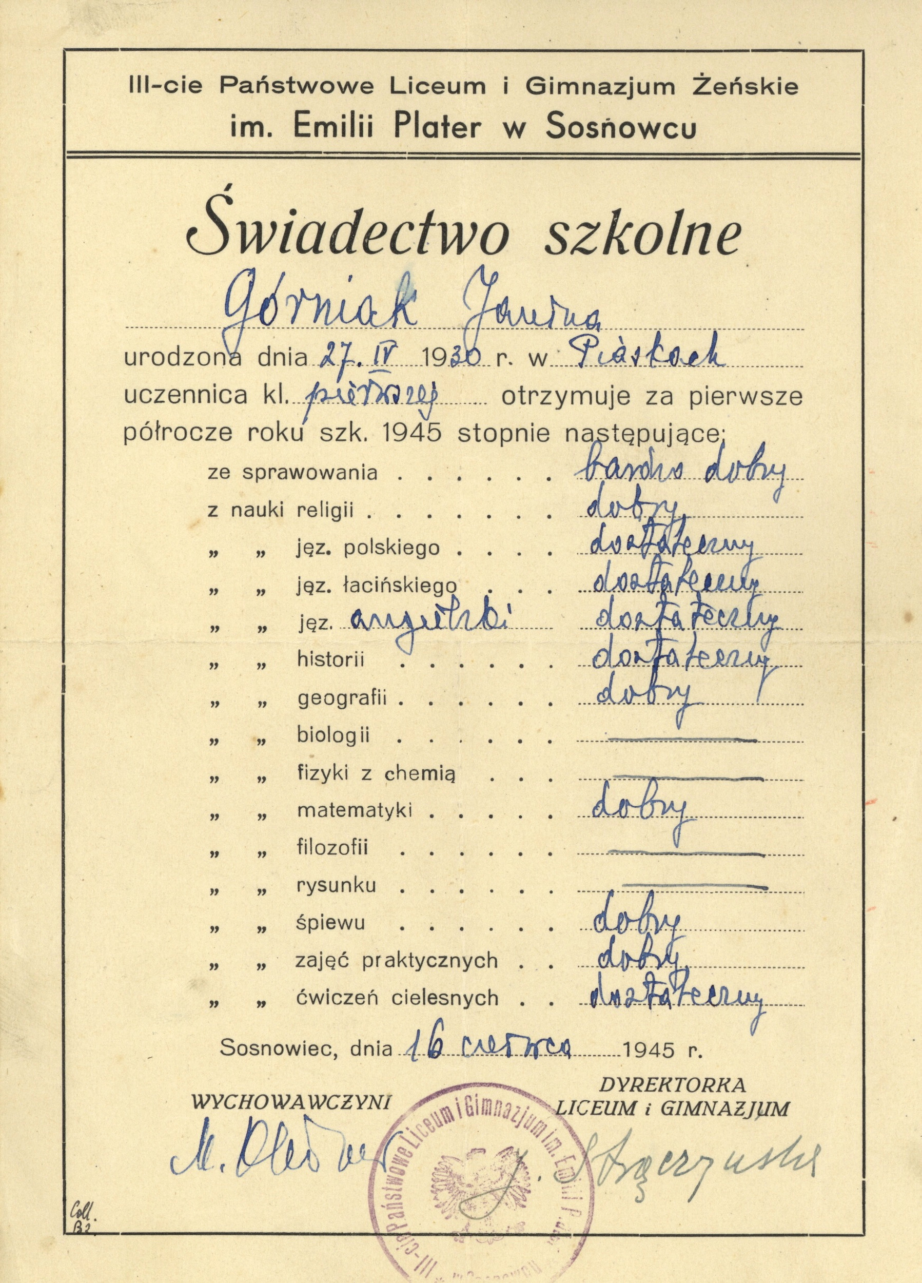 Pierwsze powojenne świadectwo Janiny Górniak, otrzymane w znanym zagłębiowskim liceum im. Emilii Plater w Sosnowcu, czerwiec 1945 r. (IPN Ka 454/205, t. 1) -