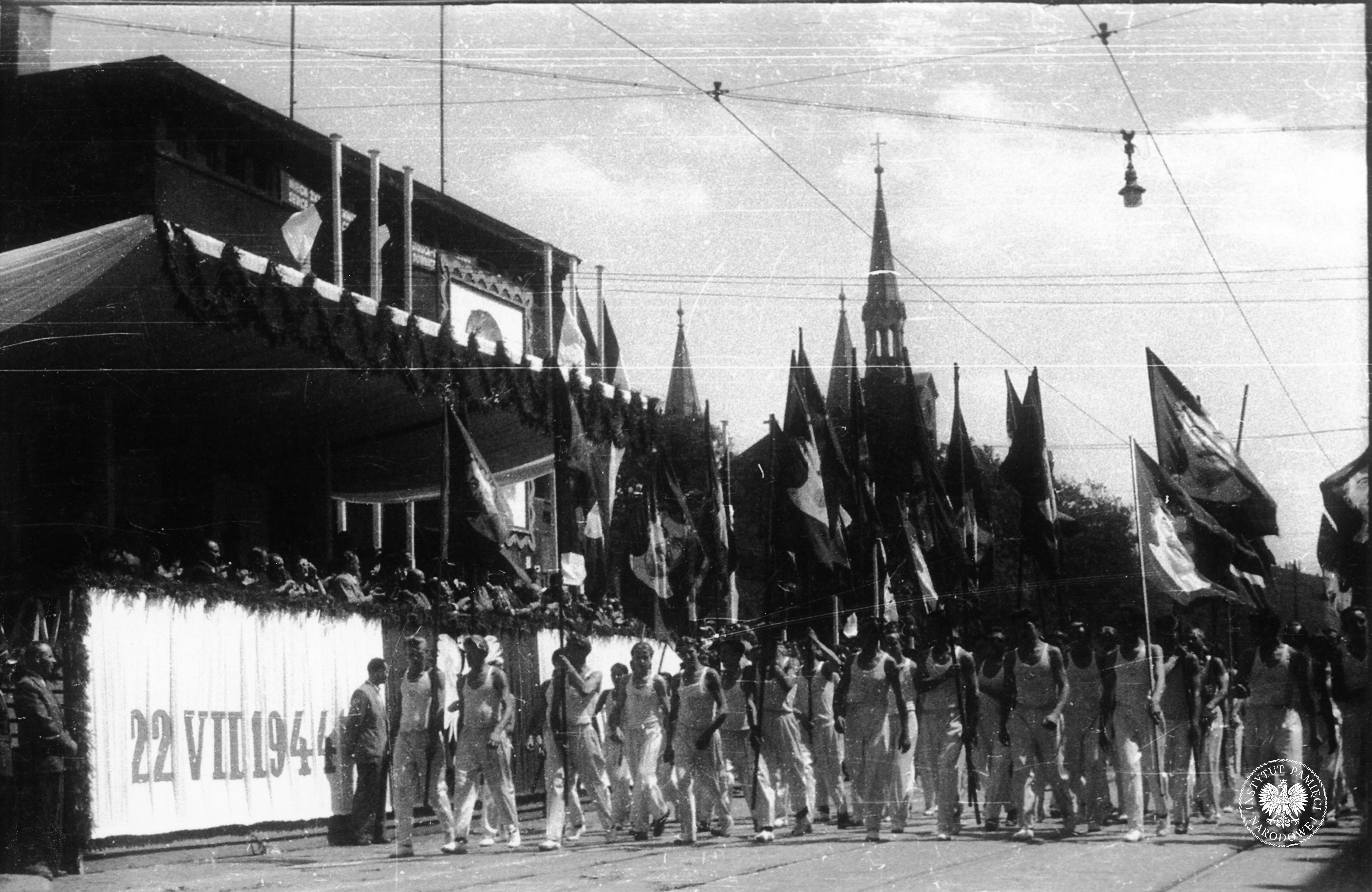 Defilada podczas Narodowego Święta Odrodzenia Polski w dniu 22 lipca 1953 r. na ul. Warszawskiej w Katowicach; IPN Ka 454/51, t. 2) -