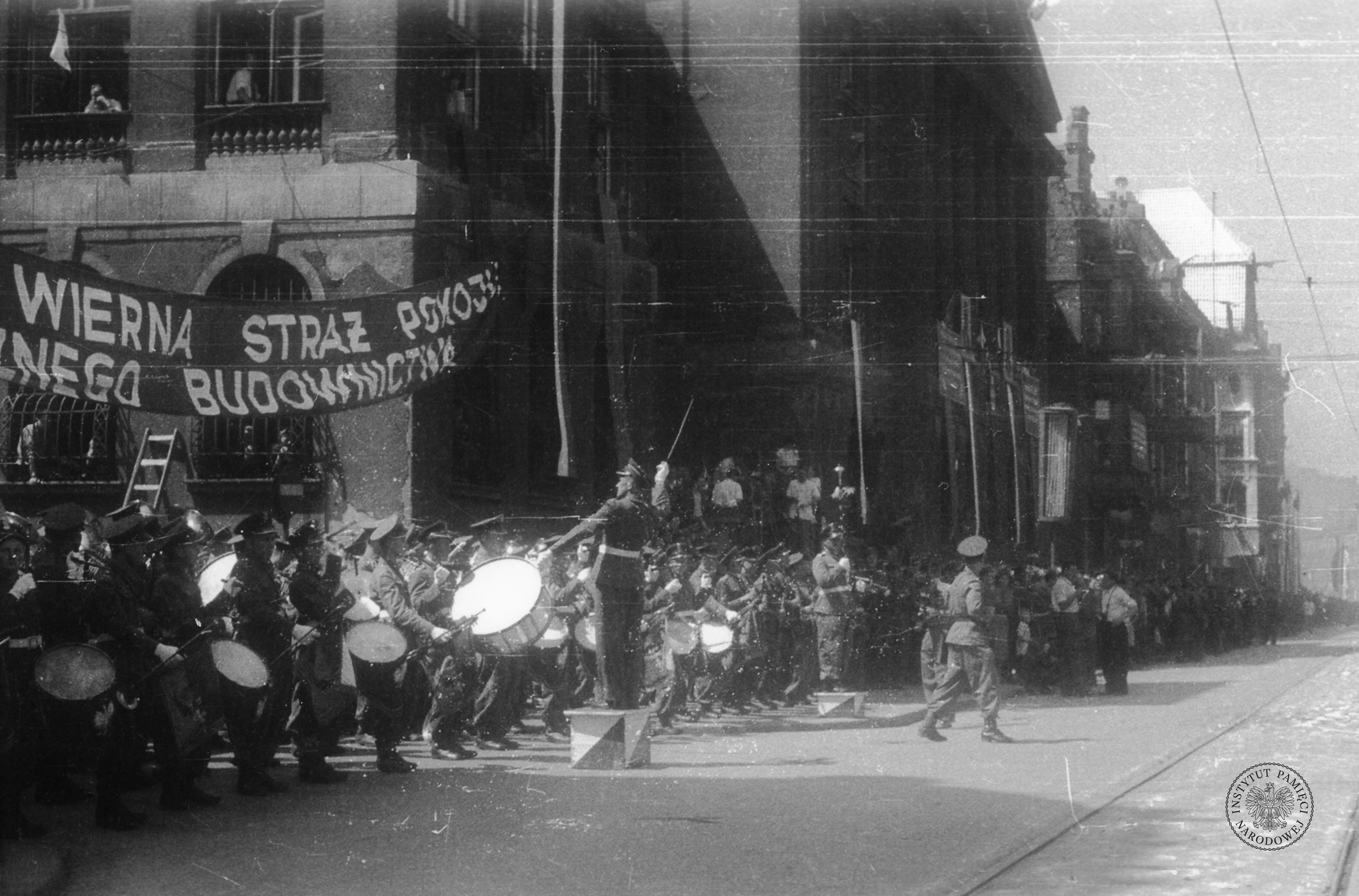 Oddział wojska i orkiestra podczas defilady w dniu 22 lipca 1953 r. na ul. Warszawskiej w Katowicach (IPN Ka 454/51, t. 2) -