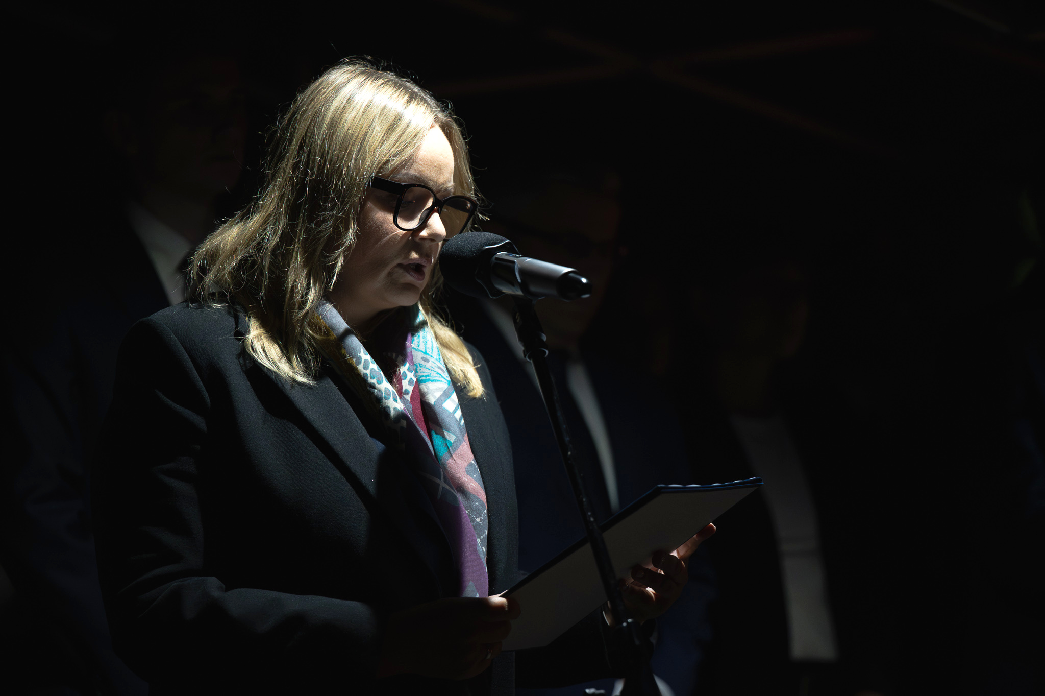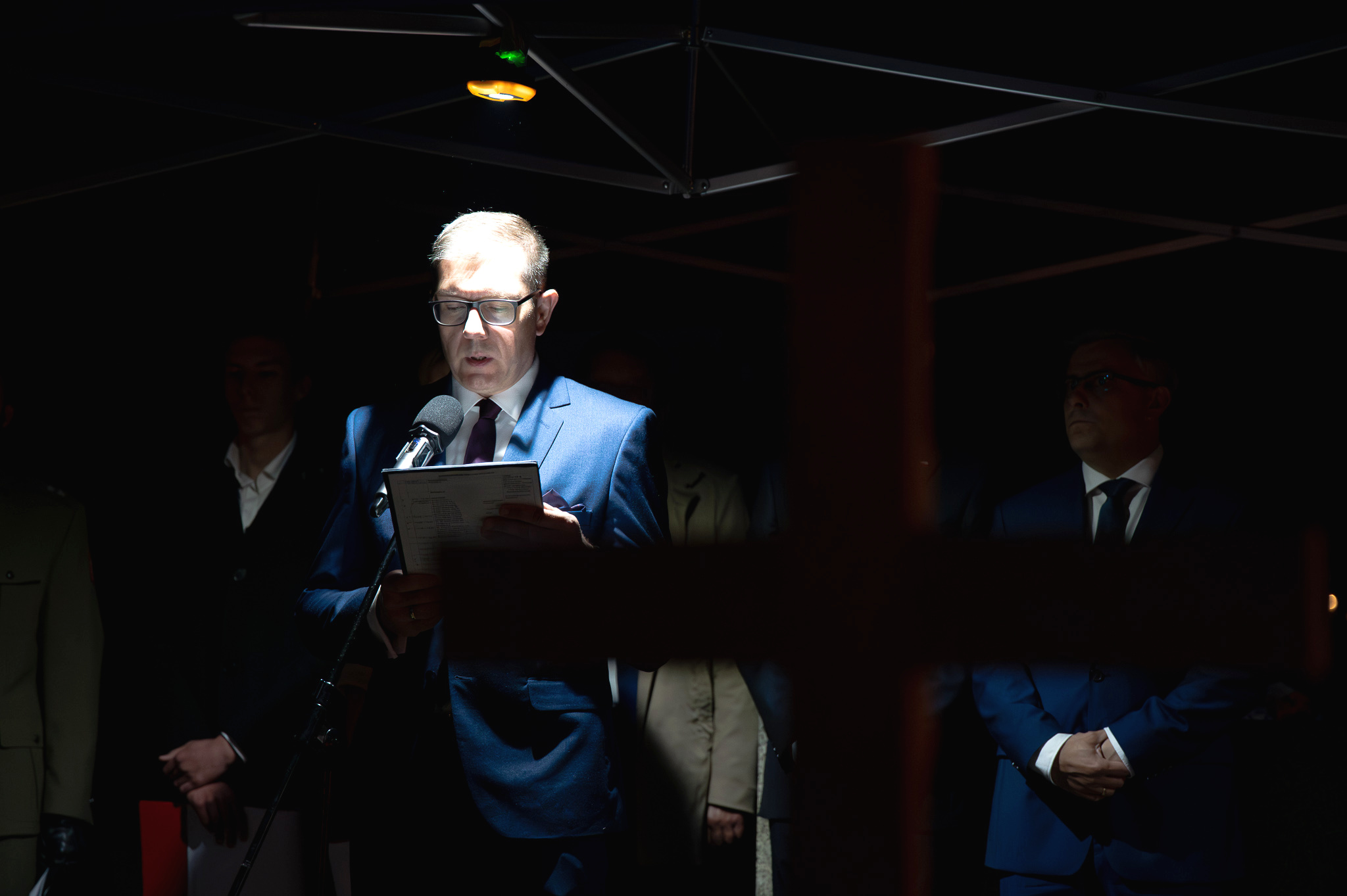 „Spotykamy się w 86. rocznicę wybuchu wojny światowej. Wojny strasznej, krwawej i długiej. Wojny, która kosztowała życie tak wielu żołnierzy na całym świecie. […] Za chwilę złożymy kwiaty, by uczcić pamięć chorążego Edwarda Szewczuka i kaprala Michała Plewaka. W ten sposób chcemy symbolicznie oddać cześć wszystkim tym, którzy walczyli w obronie Polski, a których prochy rozsiane są w różnych zakątkach globu. […] Dziękuję wszystkim tym, którzy są jeszcze żyjącymi świadkami historii i pamiętają tę straszną wojnę. Dziękujemy za ich poświęcenie, za ich trud, za ich bohaterstwo, a także za ich zwyczajne życie. […] Wojna to także krzywda matek, których synowie poszli na wojnę. Krzywda żon, które musiały pożegnać swych mężów, i krzywda dzieci, które miały może zbyt mało czasu, by poznać swoich ojców. (…) To był strach przed nieznanym, niepewność jutra i przede wszystkim tęsknota — ta dojmująca tęsknota za utraconym domem. […] Dlatego dzisiaj, my – ludzie kolejnych pokoleń – chcemy pamiętać i oddać hołd również tym ofiarom II wojny światowej. Cześć ich pamięci!”