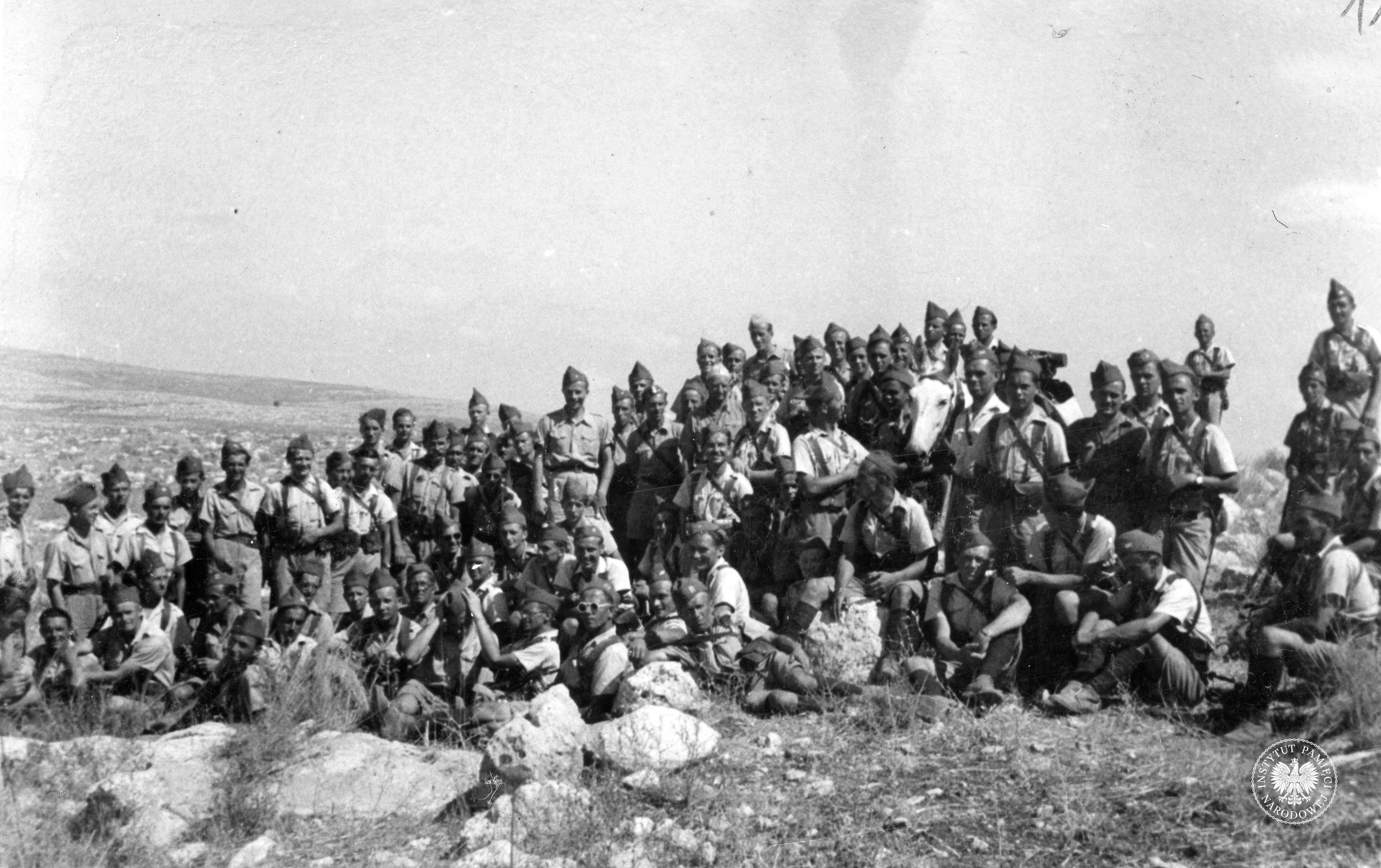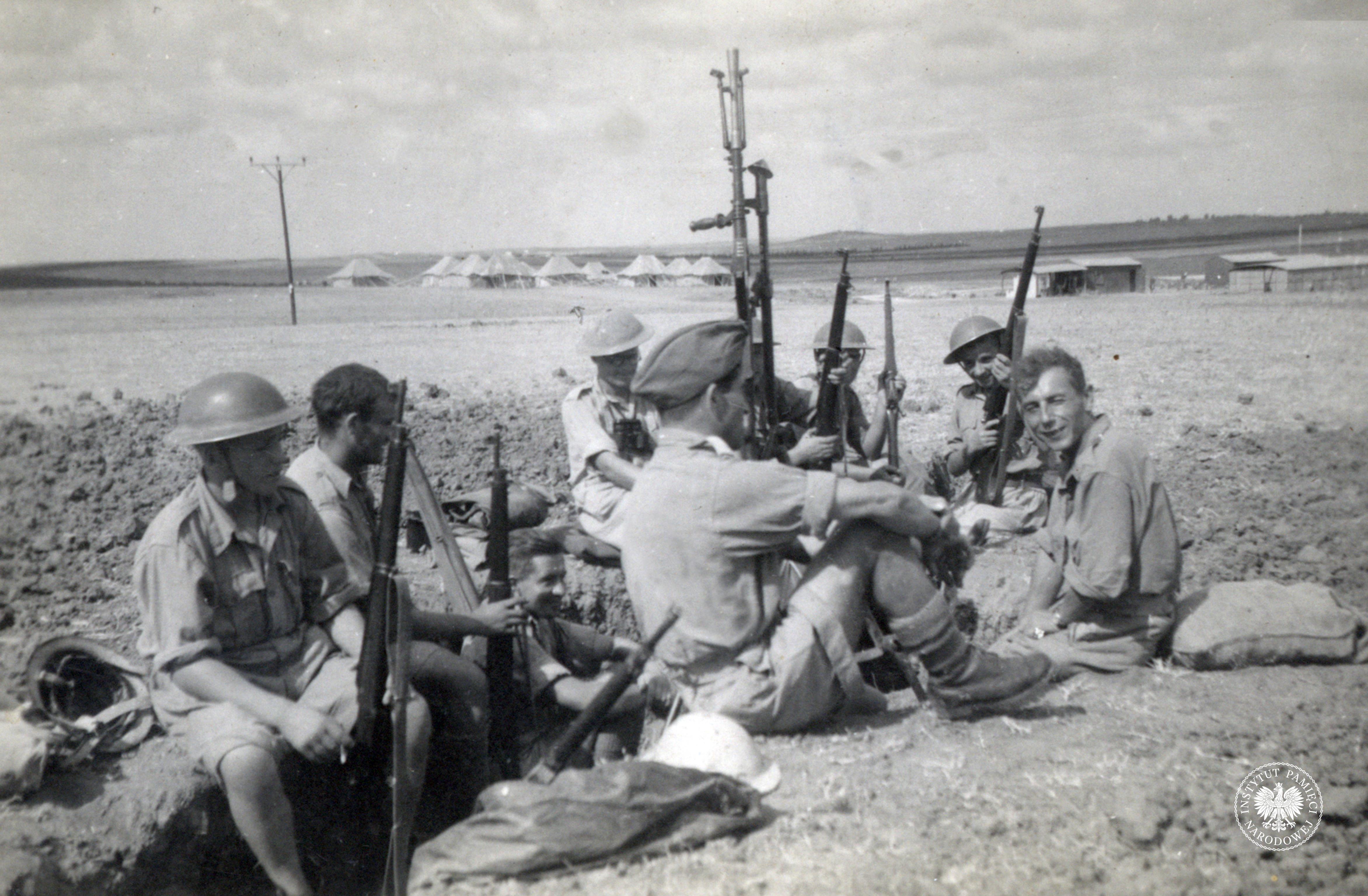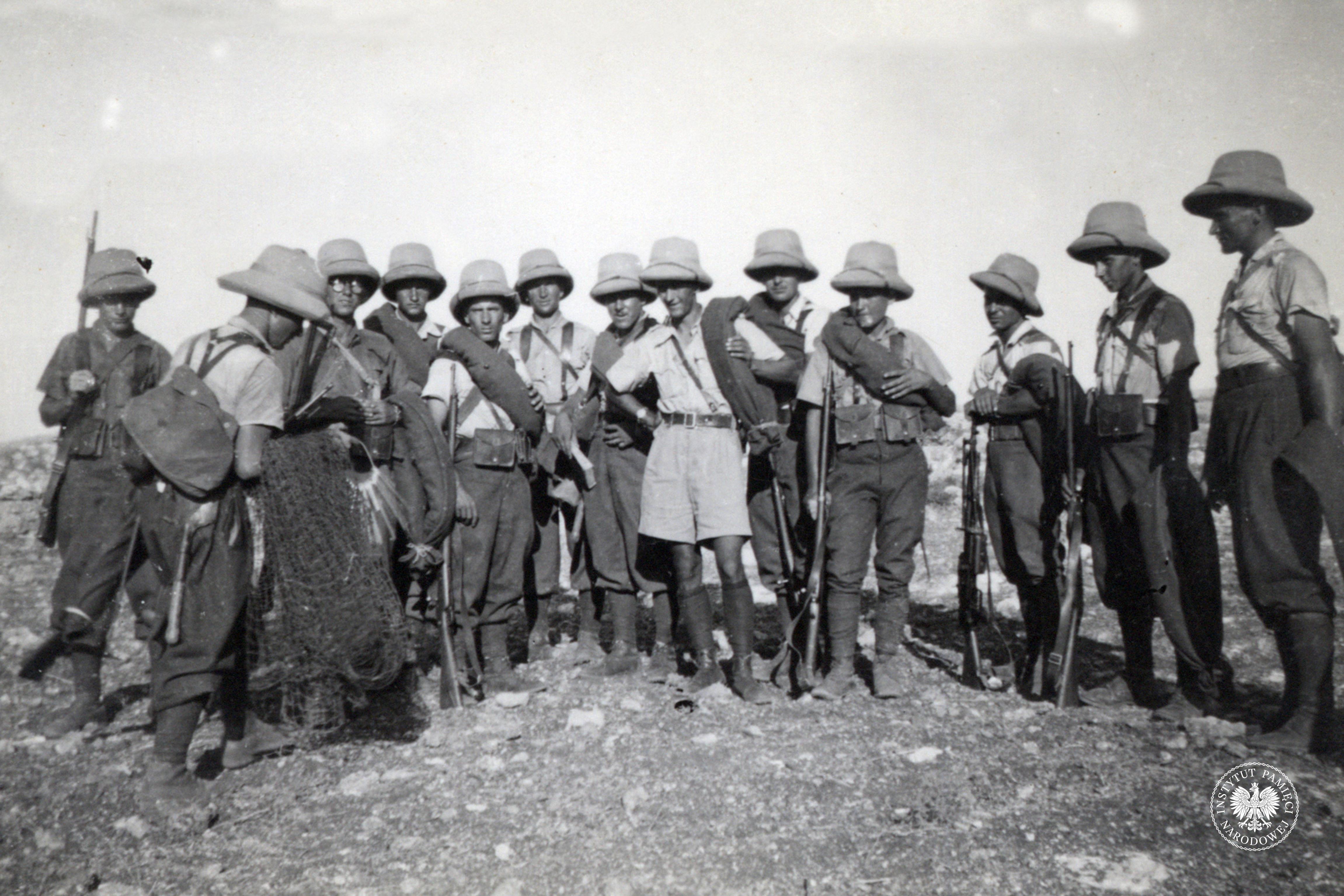 Grupa żołnierzy Wojska Polskiego w trakcie ćwiczeń/manewrów na wzgórzu Al-Latrun na terenie Brytyjskiego Mandatu Palestyny, lipiec 1940 r. (obecnie Izrael; IPN Ka 454/107, t. 1) -