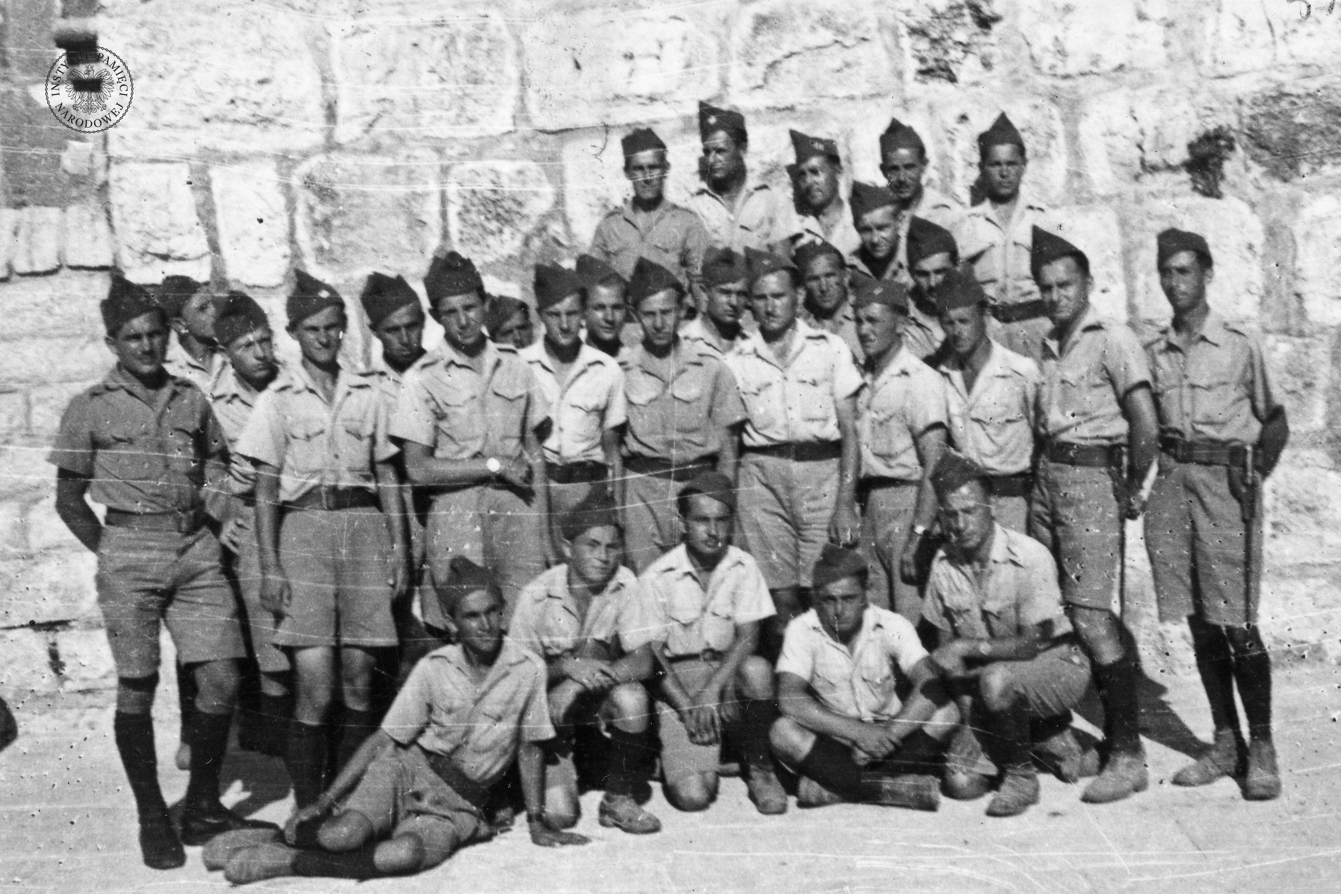 Jan Chrzanowski (trzeci od prawej strony w górnym rzędzie) i inni żołnierze na terenie obozu dla rekonwalescentów – żołnierzy alianckich w Netanji, luty 1941 r. (IPN Ka 454/79, t. 3) -