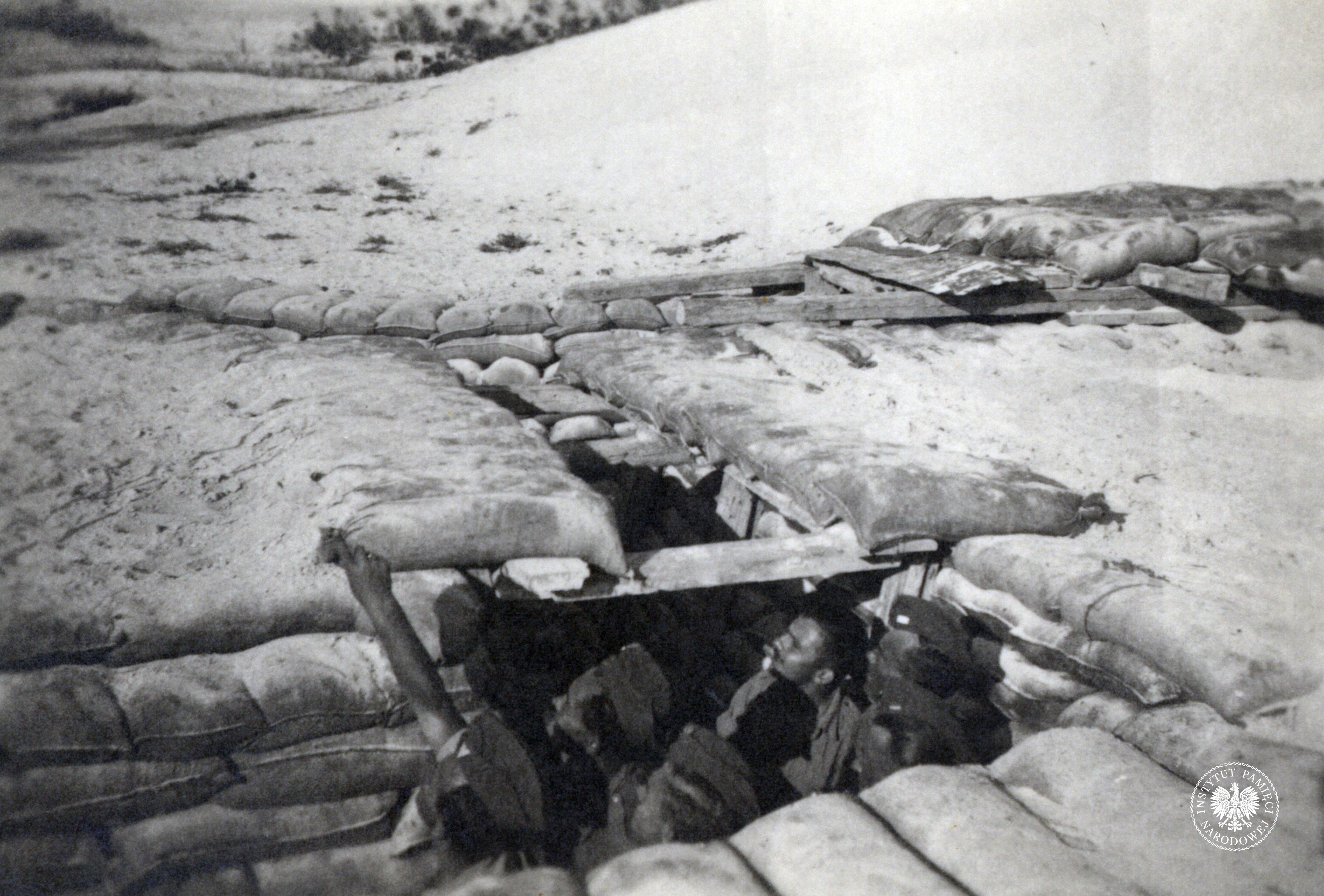 Żołnierze ze składu 4. Kompanii w okopach podczas włoskiego nalotu na Aleksandrię w listopadzie 1940 r. Właściciel zdjęcia na rewersie dodał notatkę: „Czwartacy w czasie nalotu makaronów” (IPN Ka 454/107, t. 1) -