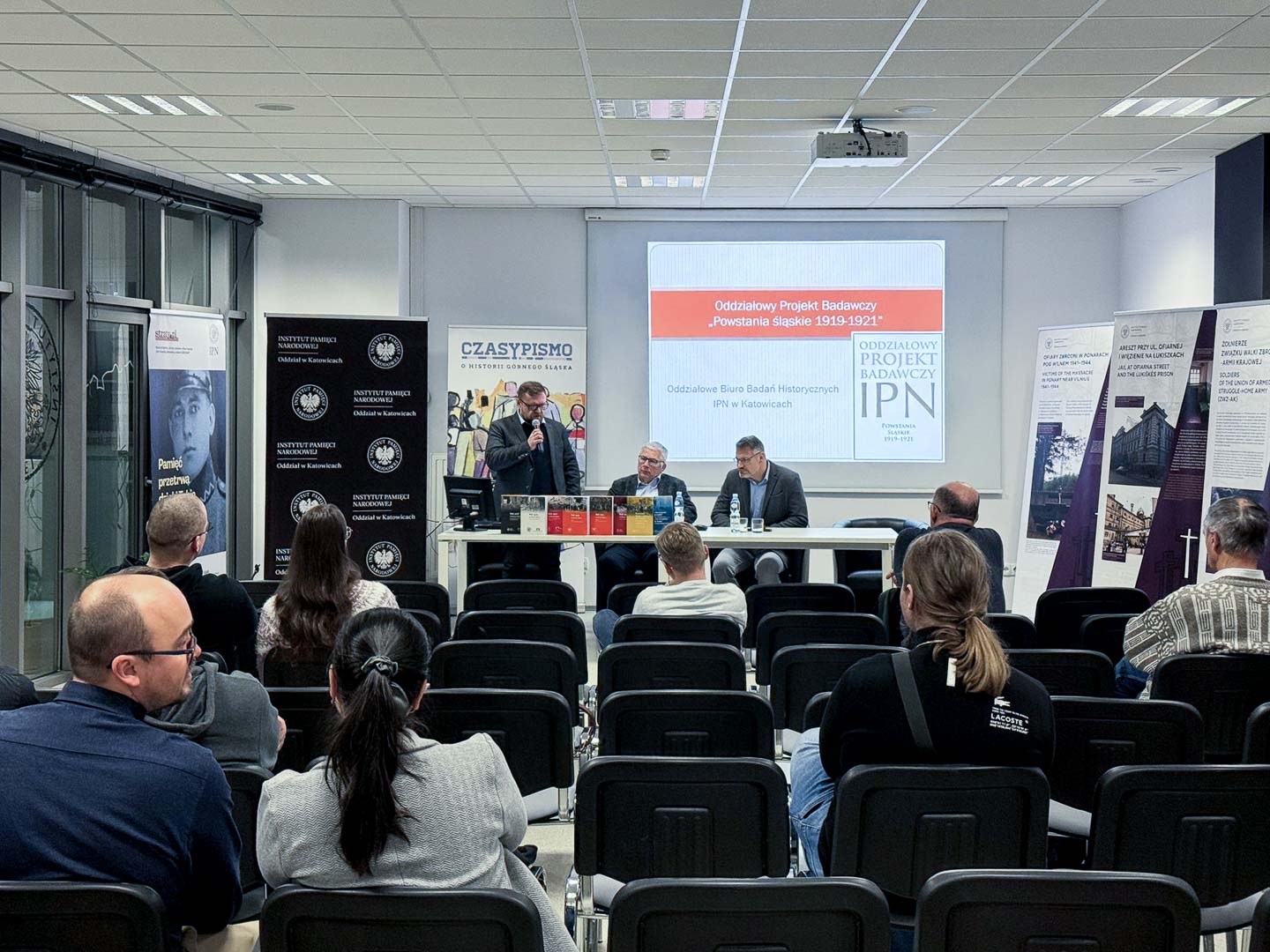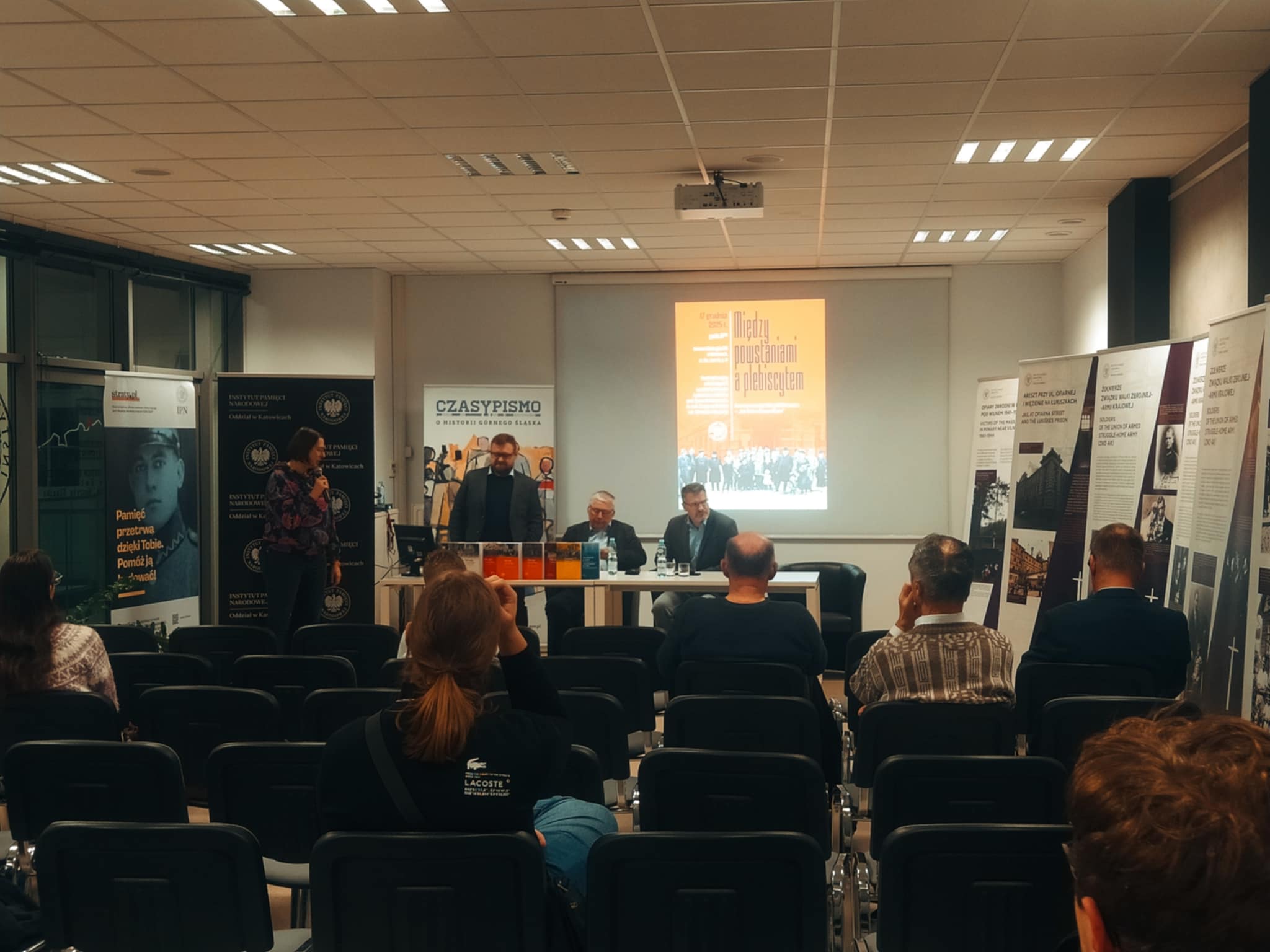 17 grudnia 2025 r., w Przystanku Historia Centrum Edukacyjnym IPN im. Henryka Sławika w Katowicach zaprezentowaliśmy naszą nową publikację oraz rozmawialiśmy o stanie badań i pamięci o wydarzeniach z lat 1919-1921 z perspektywy obchodzonych w ostatnich latach rocznic kolejnych powstań śląskich, plebiscytu oraz przyłączenia części Górnego Śląska do II Rzeczpospolitej w 1922 r. W panelu dyskusyjnym wzięli udział: prof. Ryszard Kaczmarek, dr hab. Grzegorz Bębnik i dr Mirosław Węcki.