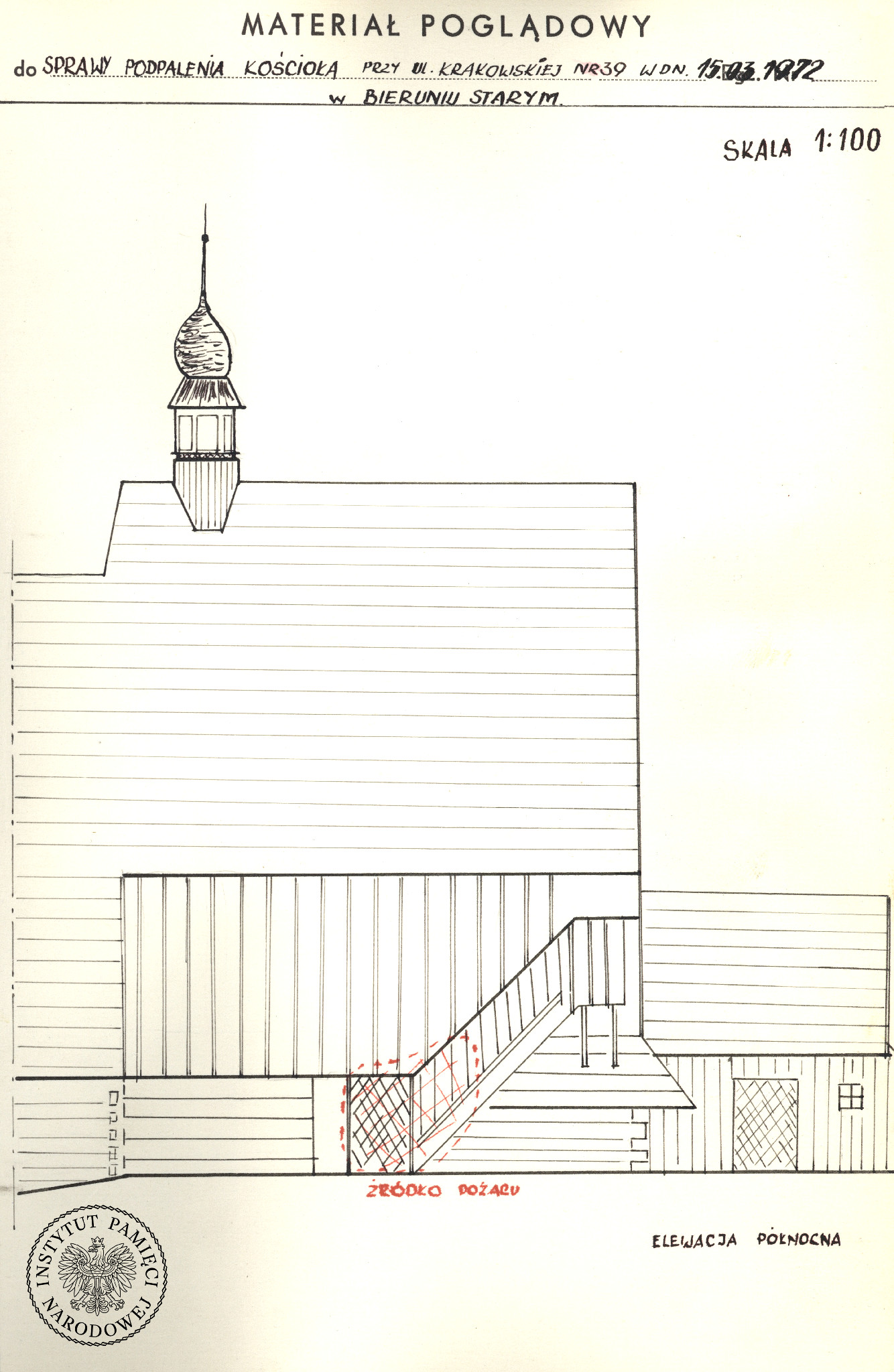 Pożar wybuchł 14 marca 1972 r. wieczorem, około 21.30. Posterunek MO w Bieruniu został powiadomiony o tym fakcie o 21.38 przez szatniarza restauracji „Stylowa”, znajdującej się naprzeciwko kościoła. Restaurację z kolei – jako jednostkę posiadającą telefon – zaalarmował przechodzień, który zauważył ogień. Milicjanci uruchomili syrenę alarmową i poinformowali inne służby, a dyżurny pospieszył na miejsce, gdzie była już „większa ilość osób usiłując w sposób niezorganizowany chronić obiekt sakralny”. Ostatecznie kościółek ratowało osiem jednostek Straży Pożarnej do 23.30. Spalił się dach, sufit i wyższe partie bocznych ścian, a wnętrze świątyni zostało częściowo zniszczone. Świadkom, którzy znaleźli się najwcześniej na miejscu, udało się wynieść i uratować przedmioty ze środka budynku. Straty wyceniono na około 300 tysięcy zł (średnia pensja wynosiła ok. 2500 zł).