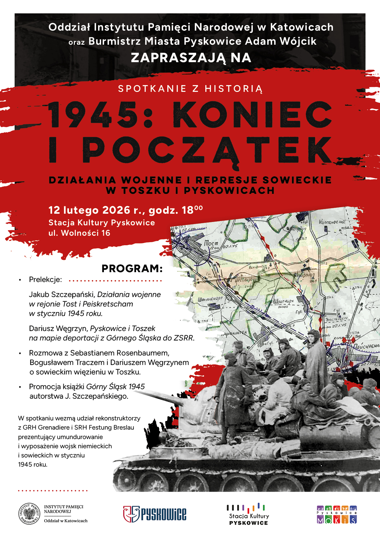 12 lutego 2026 r. w Stacji Kultury Pyskowice, przy ul. Wolności 16, odbyło się spotkanie z historią „1945: koniec i początek. Działania wojenne i represje sowieckie w Toszku i Pyskowicach”. Poświęcone było wydarzeniom mającym miejsce w Toszku i Pyskowicach w pierwszej połowie 1945 r. Tematyka prelekcji obejmowała znaczenie obu miejscowości w walkach o Górnośląski Okręg Przemysłowy, funkcjonowanie więzienia NKWD w Toszku oraz deportacje mieszkańców do ZSRR i roli w tym pyskowickiego dworca. Wystąpienia historyków uzupełnił pokaz grup rekonstrukcyjnych prezentujących umundurowanie stron walczących oraz promocja literatury historycznej dotyczącej Tragedii Górnośląskiej.