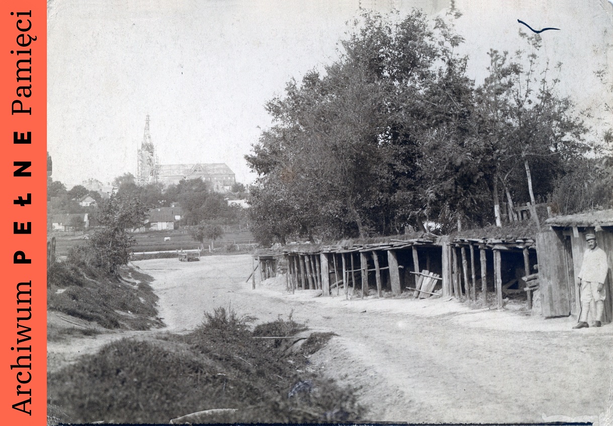 Kryjówki w Kamionce Strumiłowej. W oddali kościół pw. Wniebowzięcia NMP w trakcie budowy, Kamionka Strumiłowa sygn. IPN Ka 454/200 -