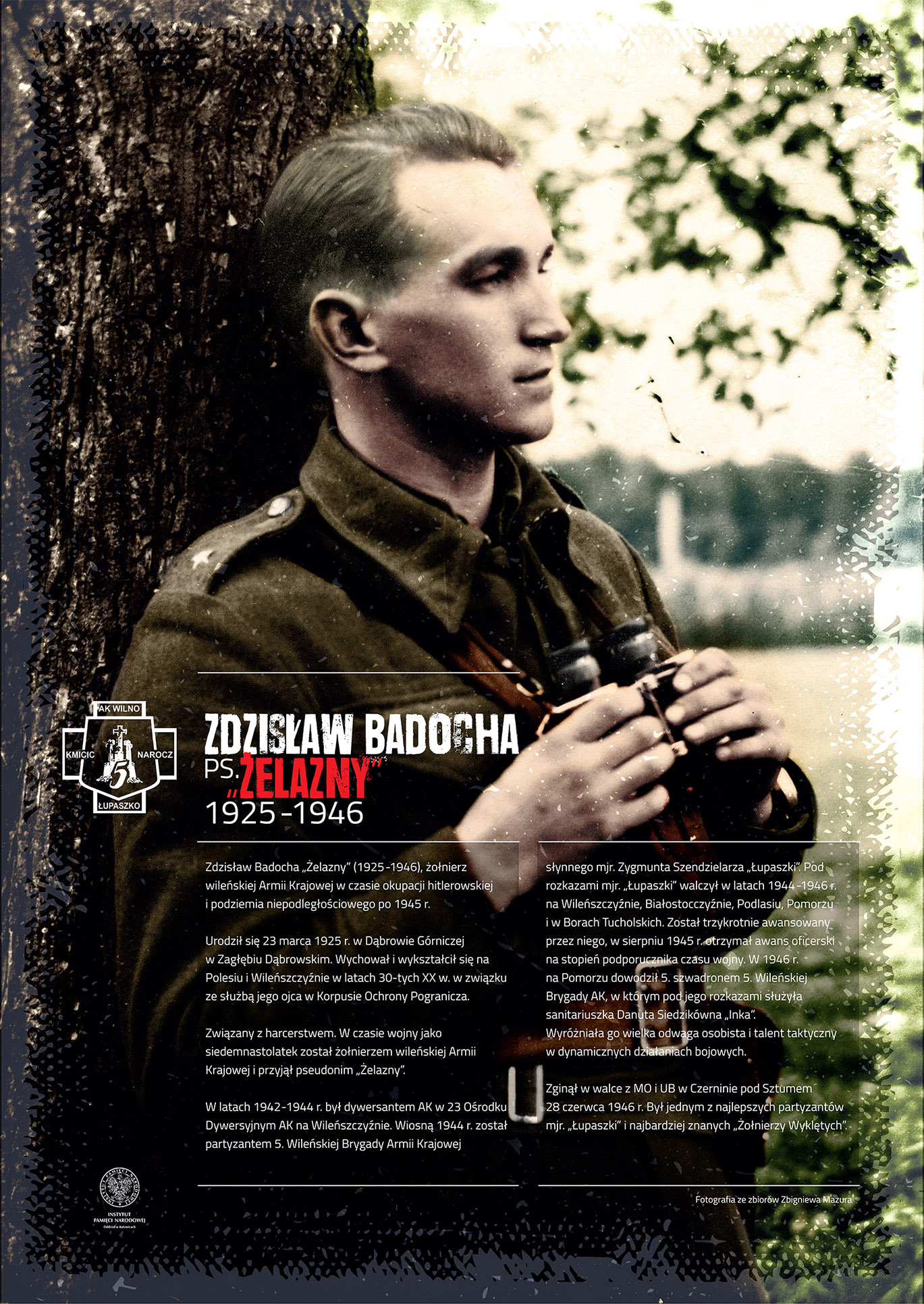 Zdzisław Badocha „Żelazny” to jedna z najbardziej fascynujących, a zarazem tragicznych postaci polskiego podziemia niepodległościowego. Urodzony w Dąbrowie Górniczej, wychowany w duchu harcerskiej służby i patriotyzmu, przeszedł szlak od konspiracji Armii Krajowej na Wileńszczyźnie po walkę w szeregach 5 Wileńskiej Brygady AK mjr. Zygmunta Szendzielarza „Łupaszki”. Jako dowódca 5 szwadronu dał się poznać jako żołnierz odważny, zdyscyplinowany i obdarzony wyjątkowym talentem dowódczym. Poległ 28 czerwca 1946 r. w wieku zaledwie 21 lat, pozostając symbolem niezłomności i wierności sprawie niepodległej Polski.