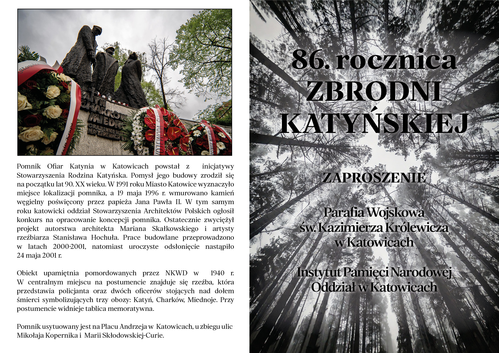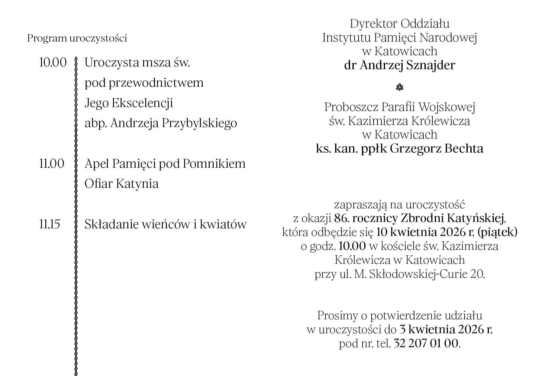 Oddział Instytutu Pamięci Narodowej w Katowicach oraz Parafia Wojskowa św. Kazimierza Królewicza w Katowicach zapraszają na obchody 86. rocznicy Zbrodni Katyńskiej, które odbędą się 10 kwietnia 2026 r. (piątek) o godz. 10.00. Na program uroczystości złożą się: uroczysta Msza św. pod przewodnictwem abp. Andrzeja Przybylskiego w kościele garnizonowym przy ul. Marii Skłodowskiej-Curie 20, przemarsz pod Pomnik Ofiar Katynia na pobliski Plac Andrzeja, Apel Pamięci oraz składanie wieńców i kwiatów.