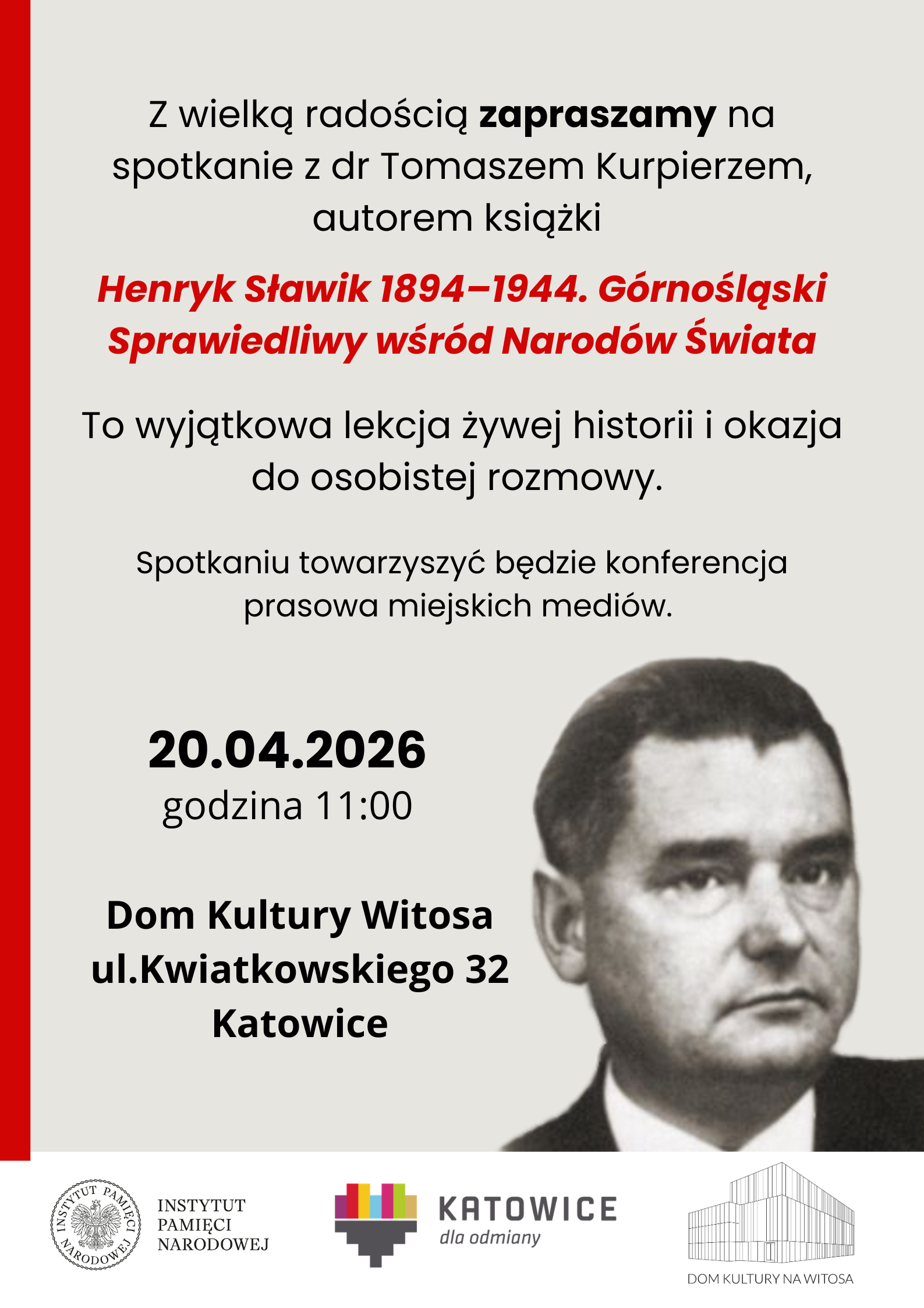 20 kwietnia 2026 r. o godz. 11.00  w Domu Kultury Witosa w Katowicach, przy ul. Kwiatkowskiego 32, odbędzie się spotkanie z dr. hab. Tomaszem Kurpierzem, autorem publikacji „Henryk Sławik 1894–1944. Górnośląski Sprawiedliwy wśród Narodów Świata“.