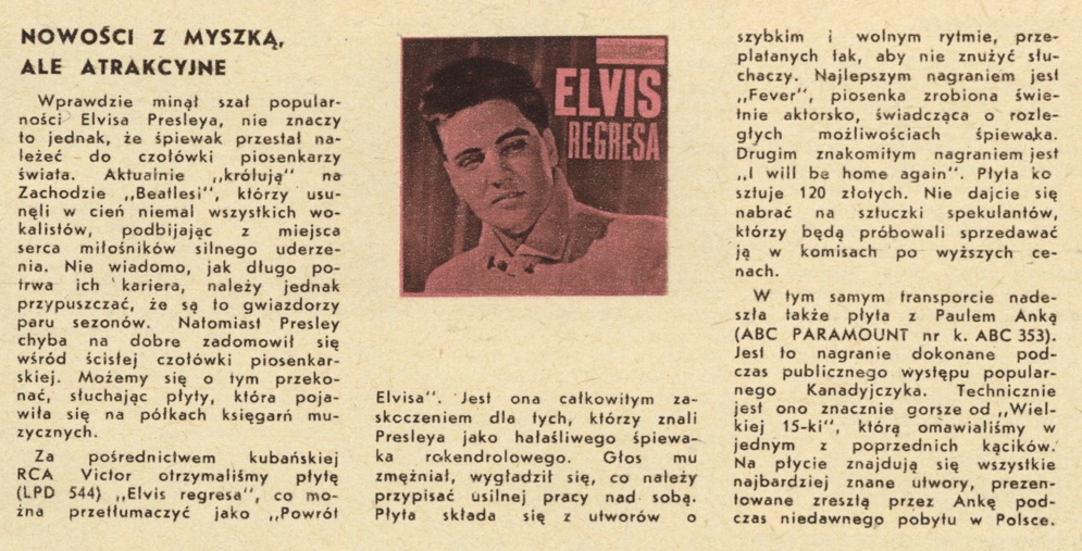 Trudno się nie uśmiechnąć czytając o kończącym się „szale popularności Elvisa Presleya”, który musiał ustąpić Beatlesom. O tych drugich redakcja napisała, że „należy jednak przypuszczać, że są to gwiazdorzy paru sezonów”. Prawdziwym hitem jest rubryka porad „Odpowiedzi ciotki Gustli”; tego nie sposób opowiedzieć, dlatego niech Czytelnicy sami posmakują tej wiedzy. Miłej lektury!